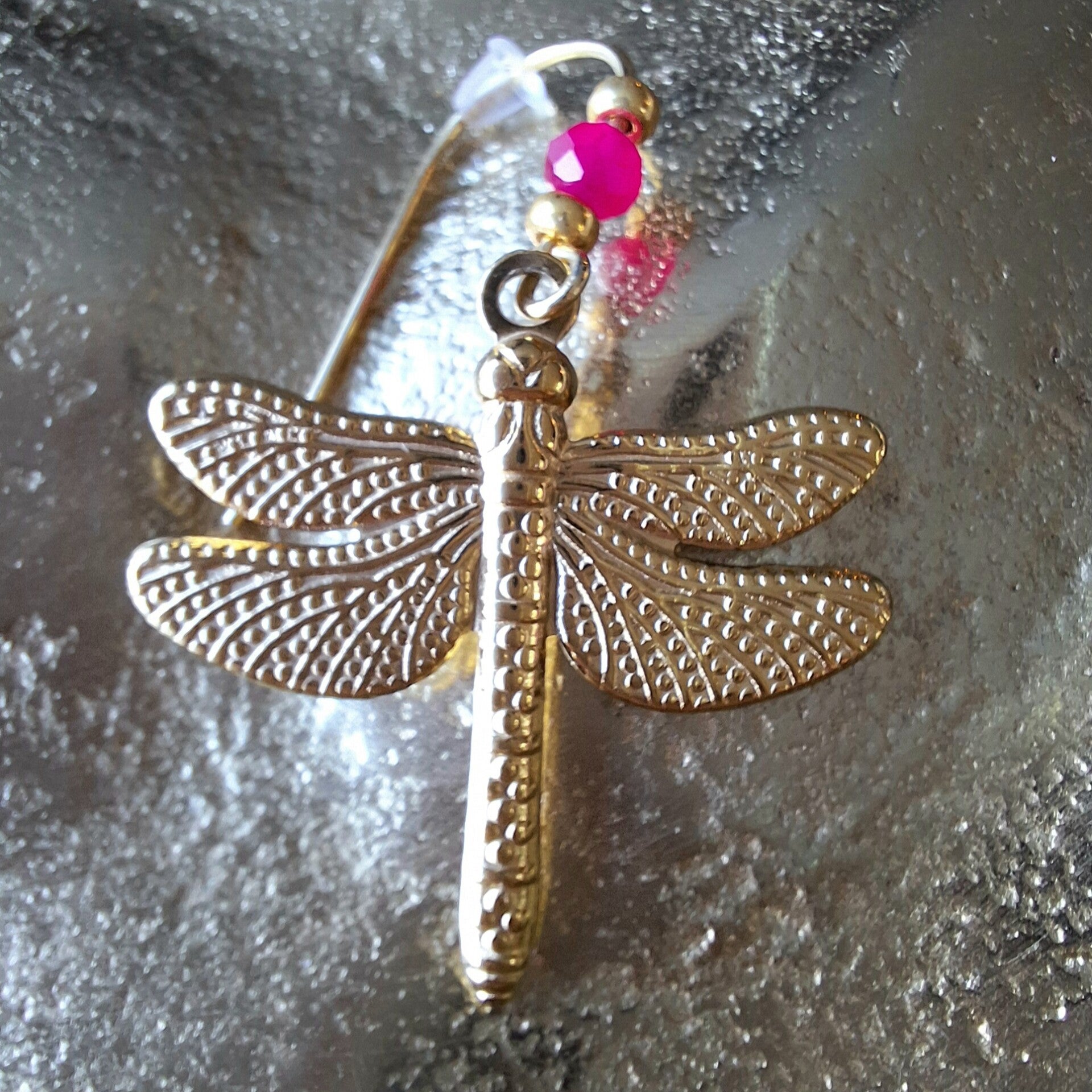Goudkleurige stainless steel oorbellen met een stainless steel libelle van 3cm lang
