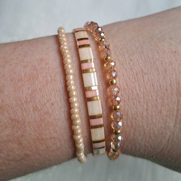 Armbandenset van Miyuki glaskralen en facetkralen in de kleuren zalmroze met beige, verfijnd met goudkleurige accenten.