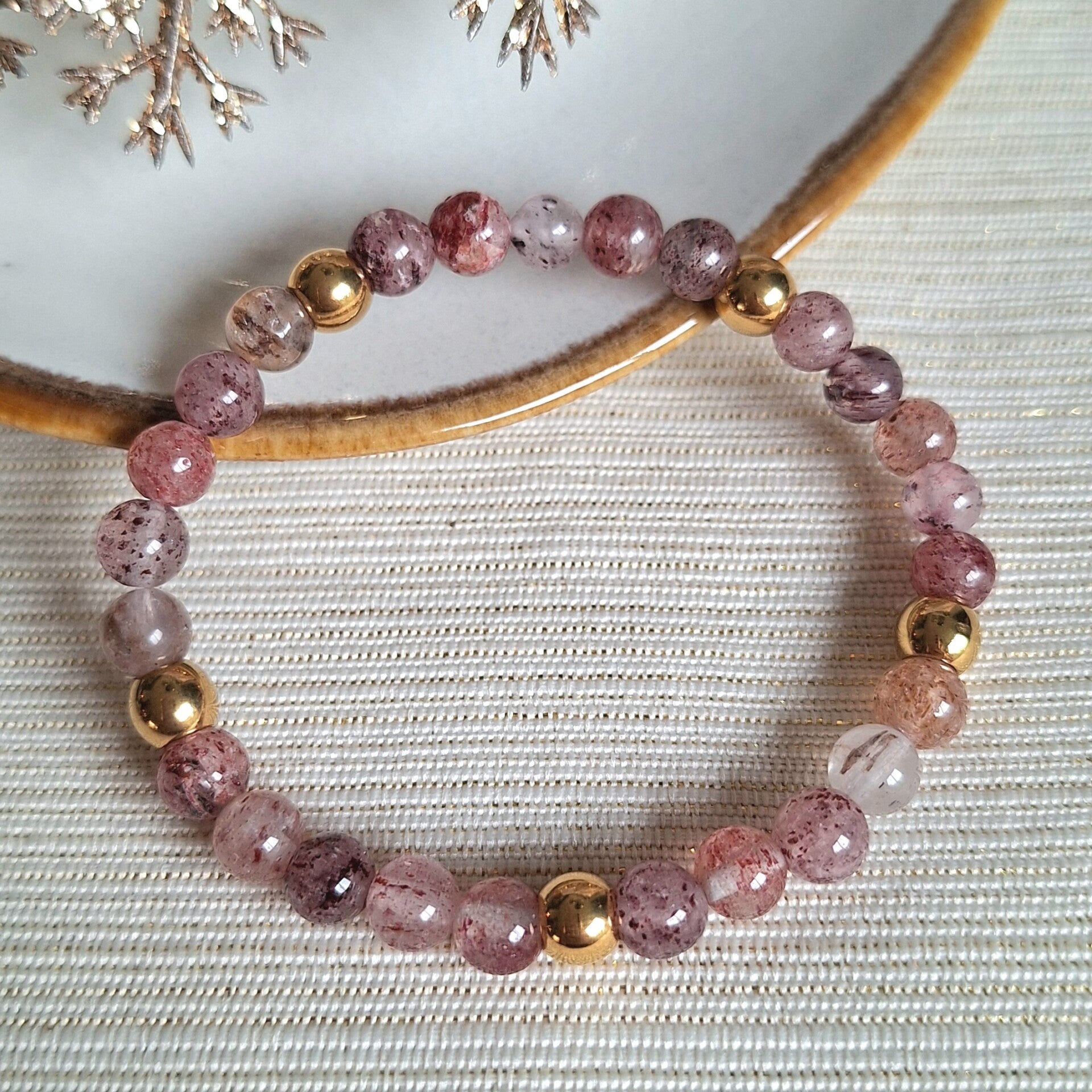 Deze handgemaakte armband van aardbeienkwarts heeft een zachte en elegante uitstraling. De goudkleurige RVS accenten zorgen voor een verfijnde en stijlvolle touch. Aardbeienkwarts staat bekend om zijn liefdevolle en harmoniserende energie en helpt bij het bevorderen van positiviteit, zelfliefde en emotioneel evenwicht.