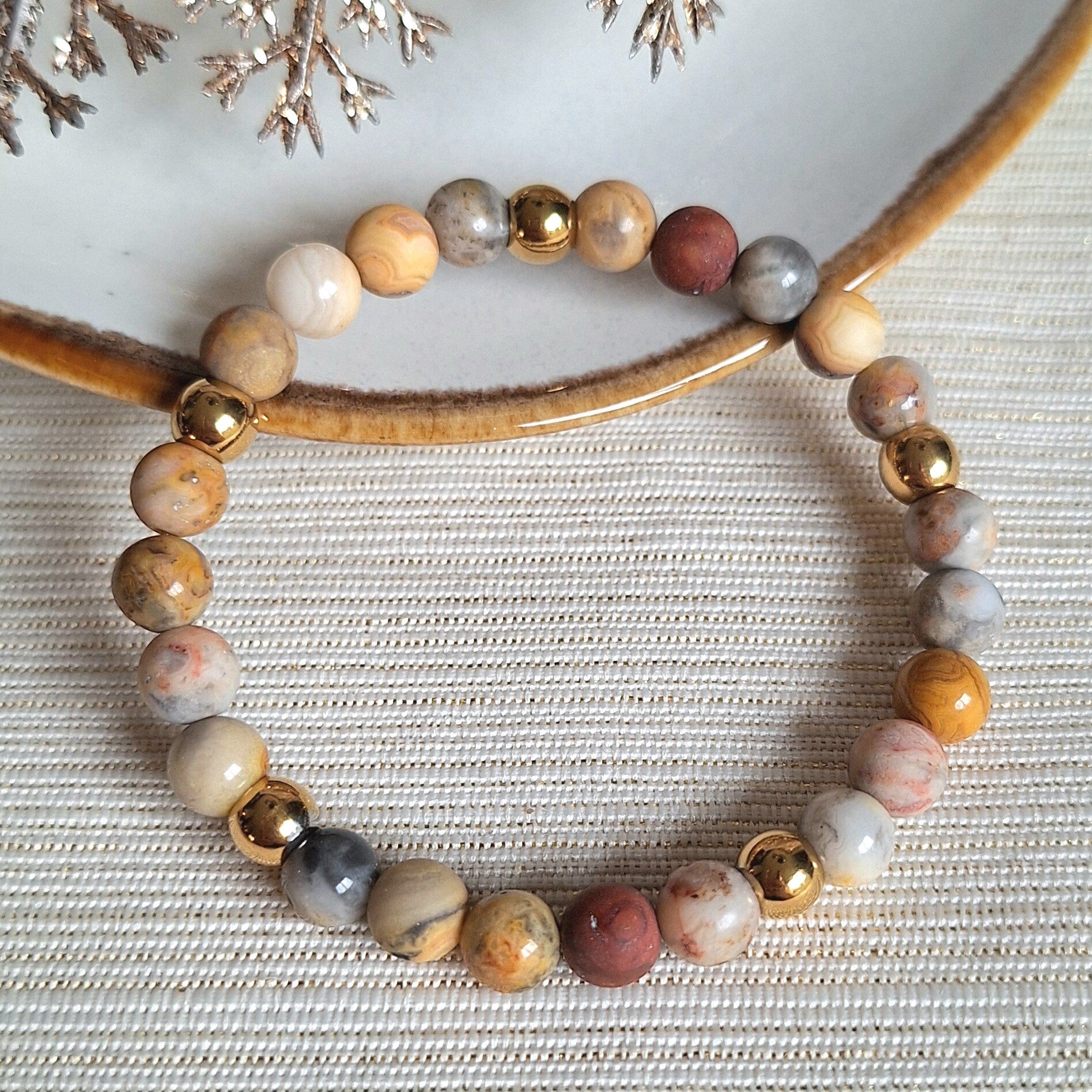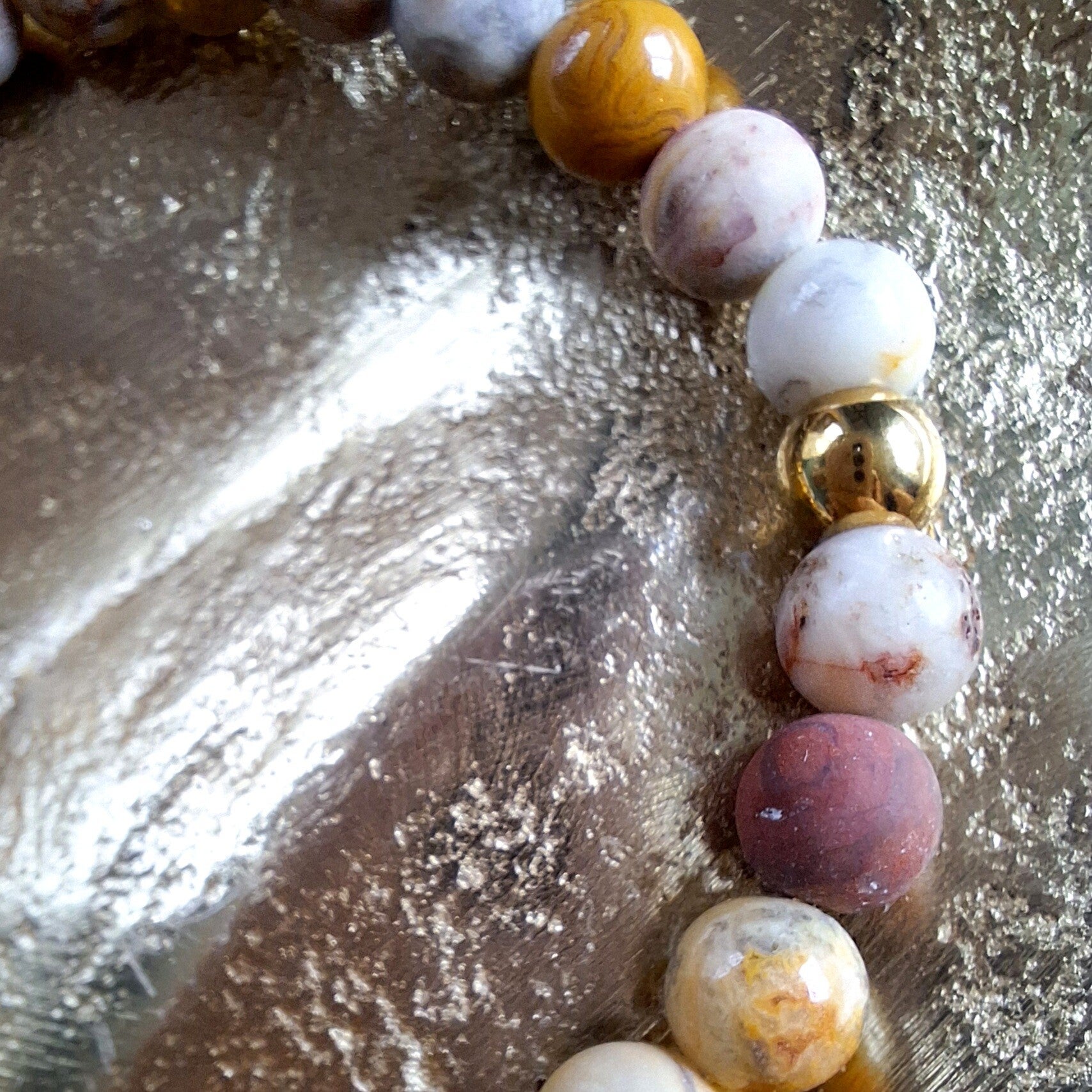 Deze handgemaakte armband van crazy agaat heeft een speelse en elegante uitstraling. De goudkleurige RVS accenten zorgen voor een verfijnde en stijlvolle touch. Crazy agaat staat bekend om zijn aardende en stabiliserende eigenschappen en helpt bij het bevorderen van innerlijke rust, balans en positieve energie.