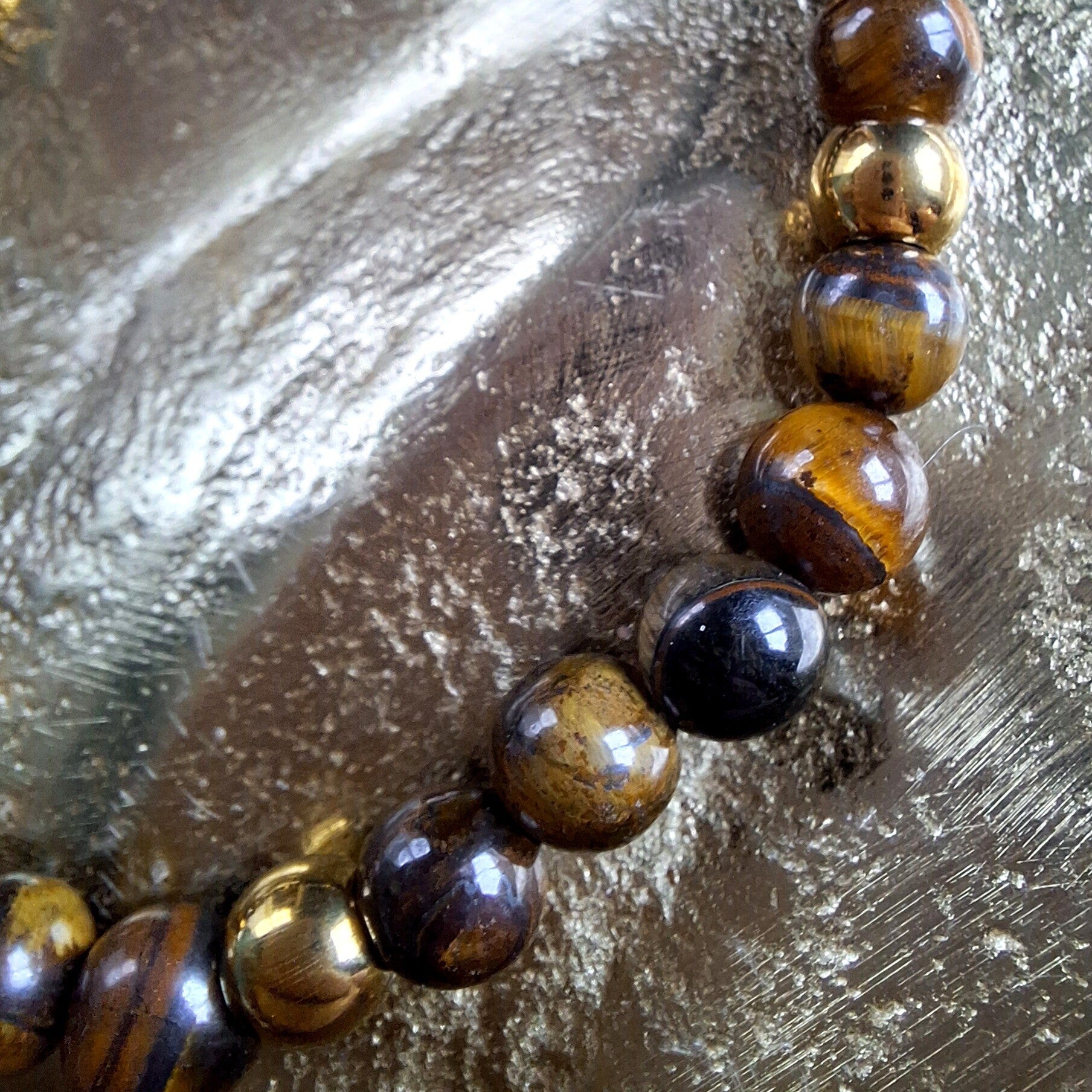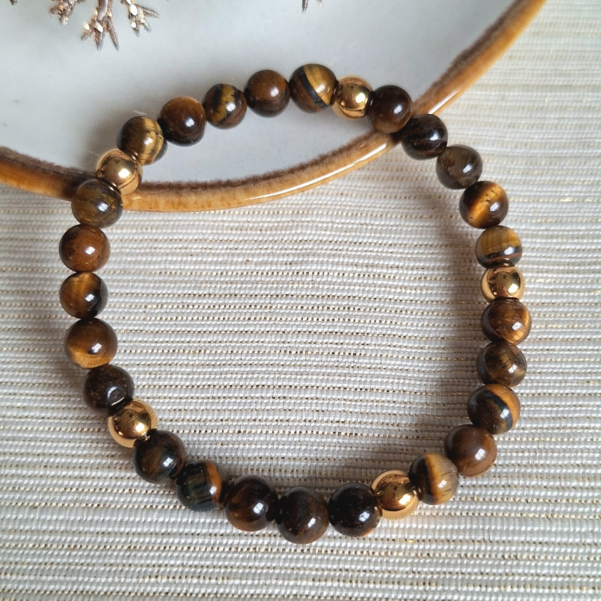 Deze handgemaakte armband van tijgeroog heeft een stoere en verfijnde uitstraling. De goudkleurige RVS accenten zorgen voor een elegante en stijlvolle touch. Tijgeroog staat bekend om zijn beschermende en versterkende eigenschappen, en helpt bij het bevorderen van zelfvertrouwen en innerlijke kracht.