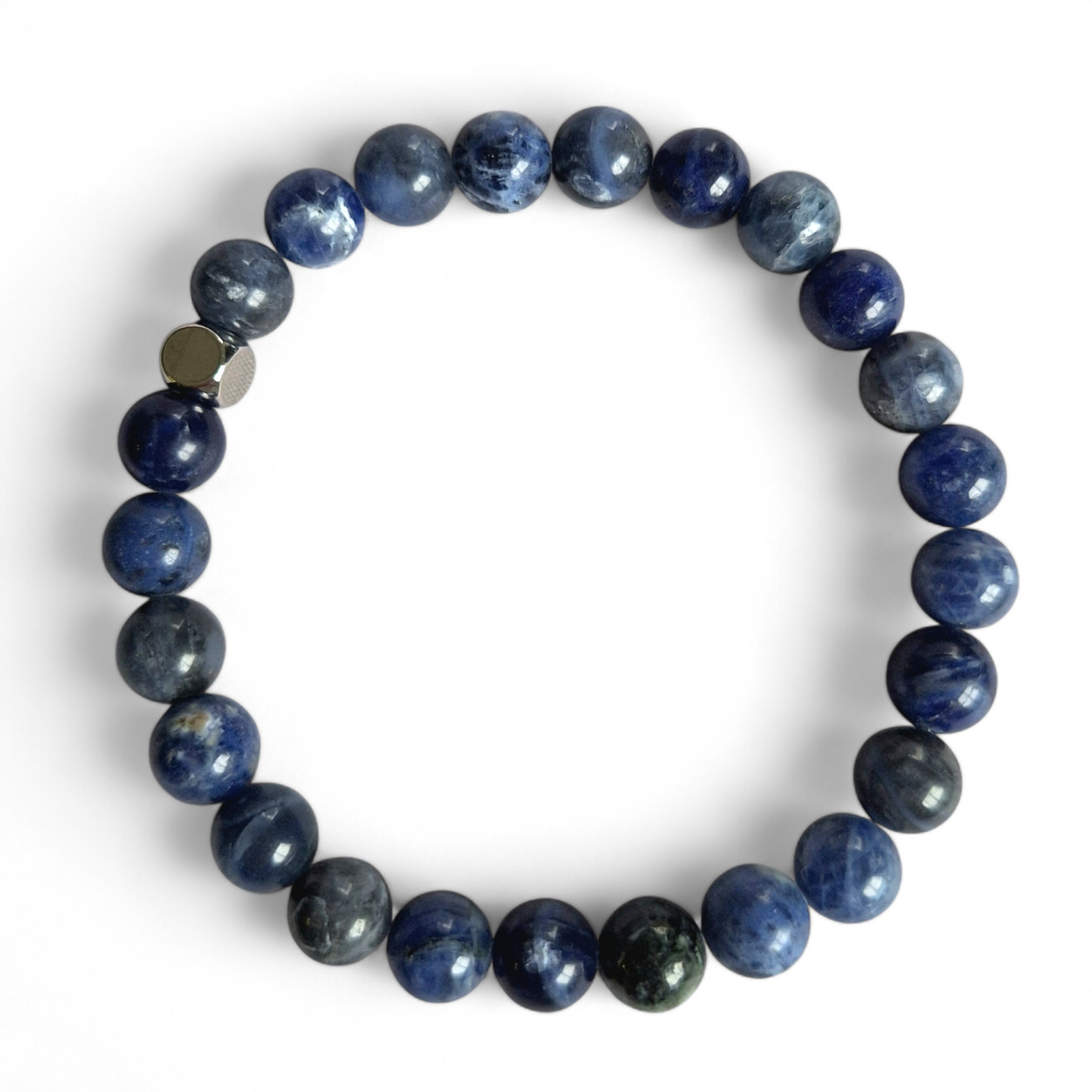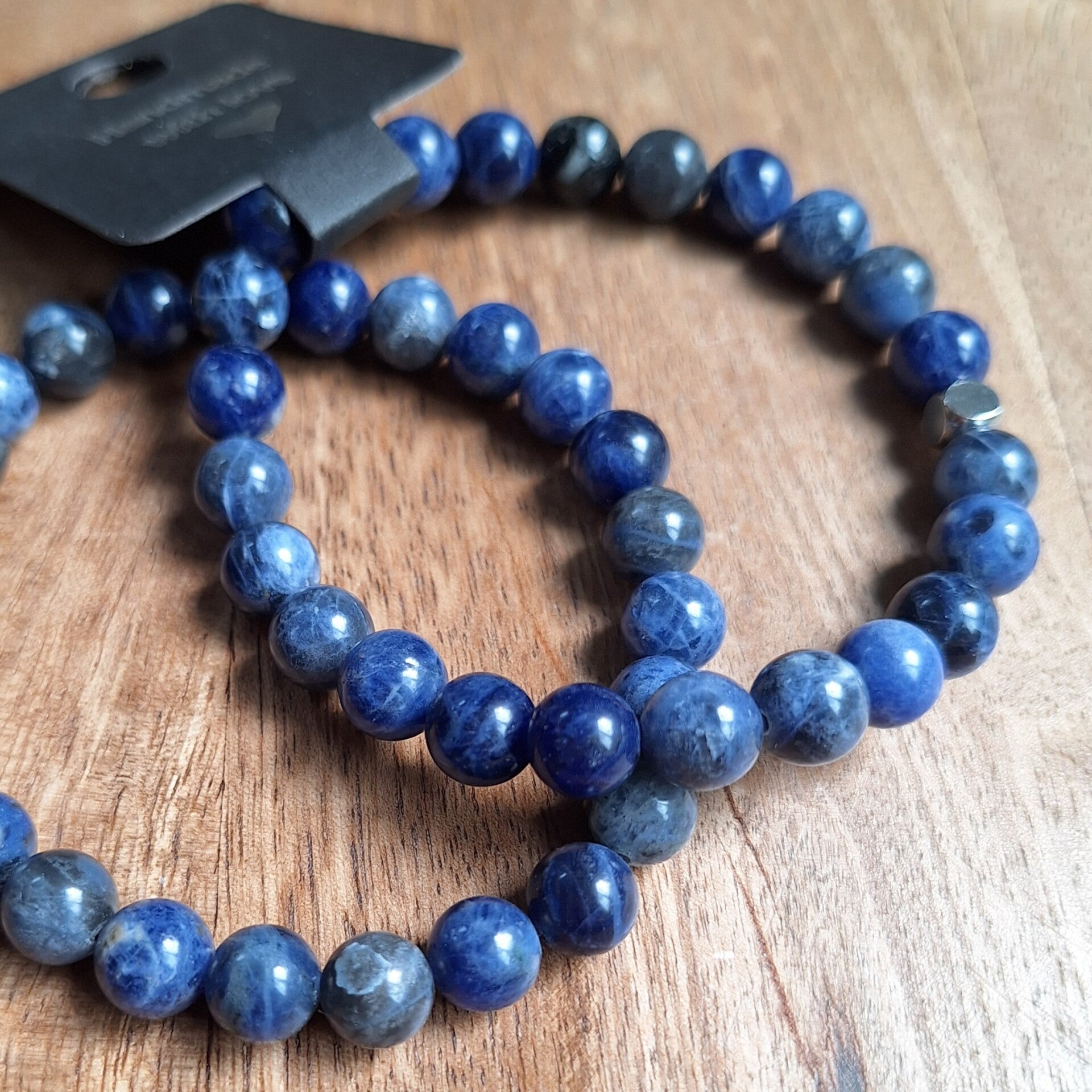 Deze herenarmband is gemaakt van 8mm sodaliet-kralen en afgewerkt met een stainless steel kubuskraal. De diepblauwe tinten van de sodaliet, gecombineerd met witachtige aderen, geven de armband een rustige en stoere uitstraling. Dankzij het elastische ontwerp zit de armband comfortabel om de pols. Sodaliet staat bekend om zijn bevorderende werking voor communicatie en het versterken van logisch denken. Het is een steen die vaak geassocieerd wordt met innerlijke rust en helderheid. Deze armband is een stijlvol accessoire dat zowel solo als in combinatie met andere armbanden gedragen kan worden.