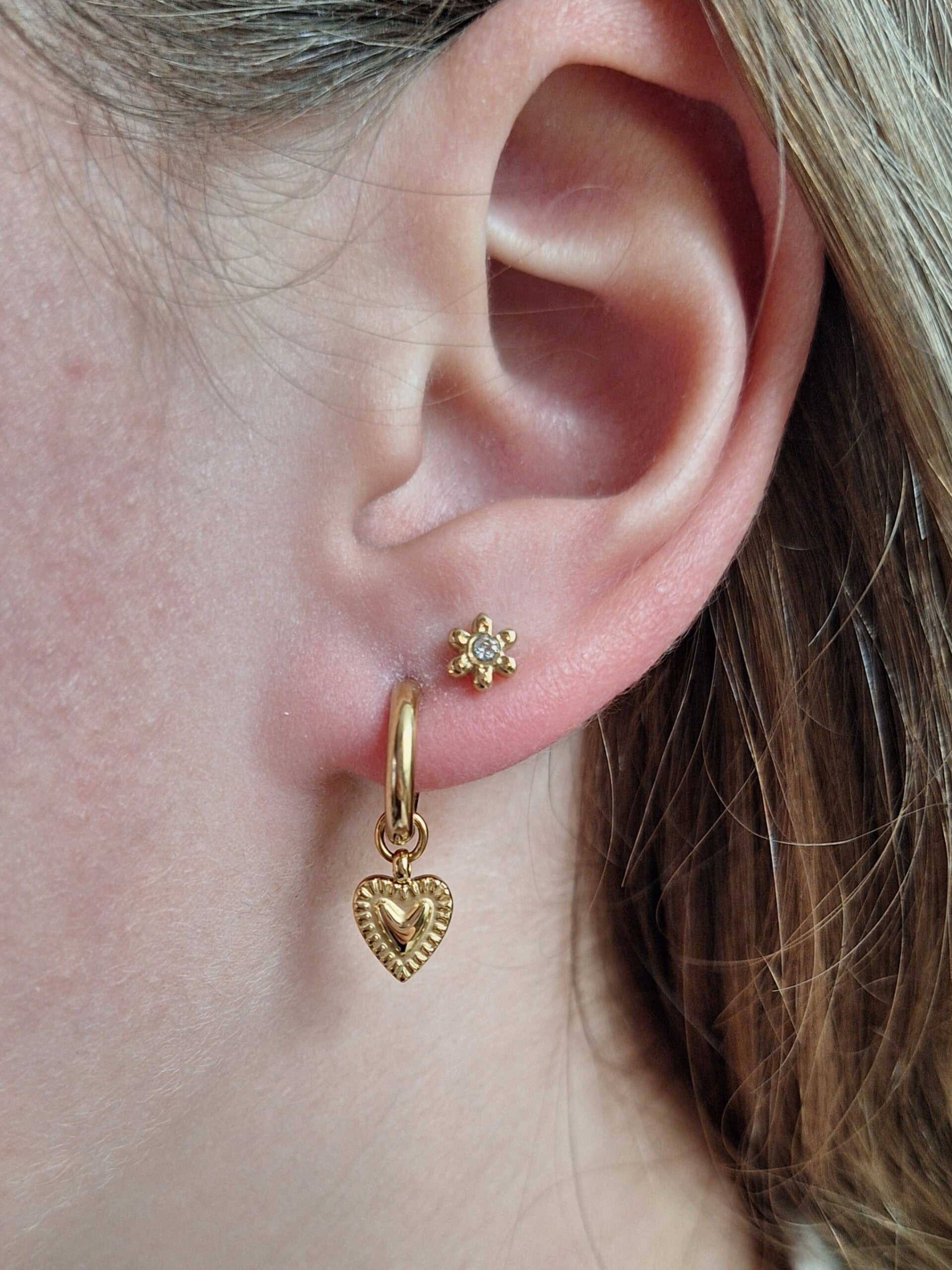 Deze schattige goudkleurige creooltjes zijn voorzien van een prachtig hartvormig stainless steel bedeltje, perfect voor kleine sieradenliefhebbers. Het subtiele formaat van 12x2mm maakt ze ideaal voor kinderoren, terwijl het roestvrijstalen materiaal zorgt voor duurzaamheid en een comfortabele pasvorm. Dit lieve hartje geeft de oorbellen een tijdloze en speelse uitstraling, perfect voor zowel dagelijks gebruik als speciale gelegenheden. Een prachtig sieraad om cadeau te geven of om een jonge fashionista blij mee te maken!