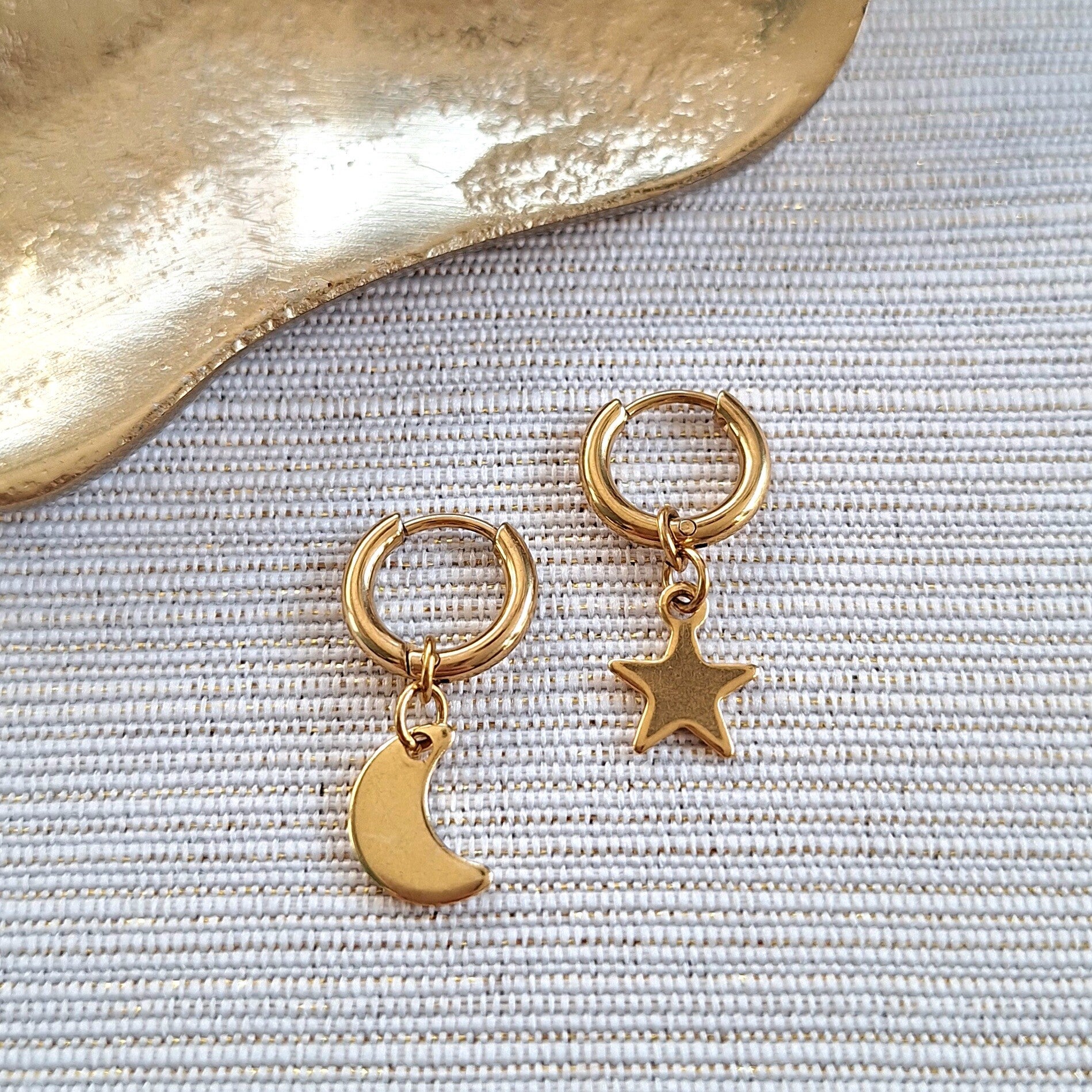 Deze magische goudkleurige creolen vormen samen de perfecte set voor kleine dromers! De ene oorbel is voorzien van een sierlijk RVS maantje, terwijl de andere een prachtige ster als bedeltje heeft. Dit speelse duo maakt elke outfit net een beetje specialer en geeft een subtiele, betoverende uitstraling. Met een formaat van 12x2mm zijn ze ideaal voor kinderoren, terwijl het roestvrijstalen materiaal zorgt voor duurzaamheid en comfort. Perfect voor kleine sterrenkijkers en maanliefhebbers die van een unieke look houden!