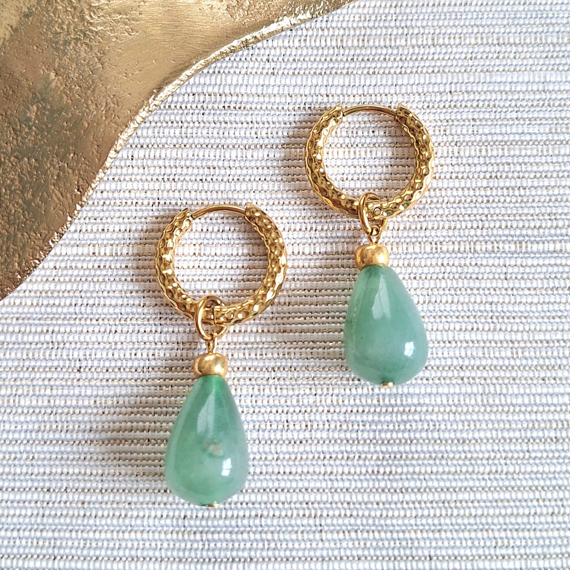 Deze stijlvolle RVS creolen (16,5 x 2,5 mm) hebben een subtiele bewerking die zorgt voor een verfijnde uitstraling. De oorbel is afgewerkt met een prachtige groene Aventurijn druppelhanger (15 x 10 mm), die een rustgevende en positieve uitstraling heeft.
