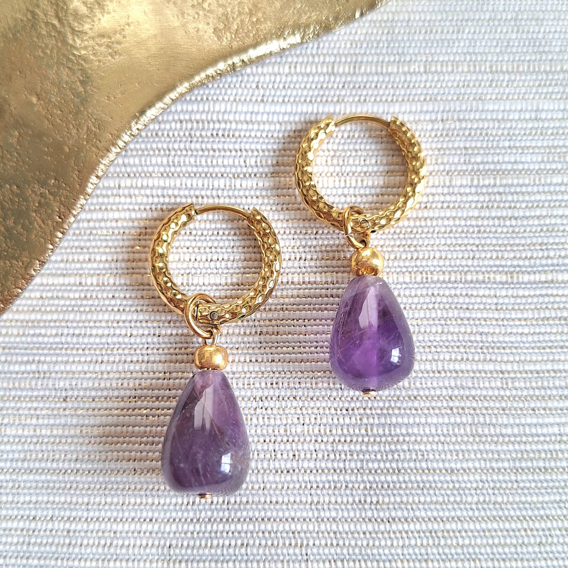 Deze elegante RVS creolen (16,5 x 2,5 mm) hebben een subtiele bewerking die zorgt voor een verfijnde uitstraling. De oorbel is afgewerkt met een prachtige amethist druppelhanger (15 x 10 mm), die een kalmerende en spirituele energie uitstraalt.