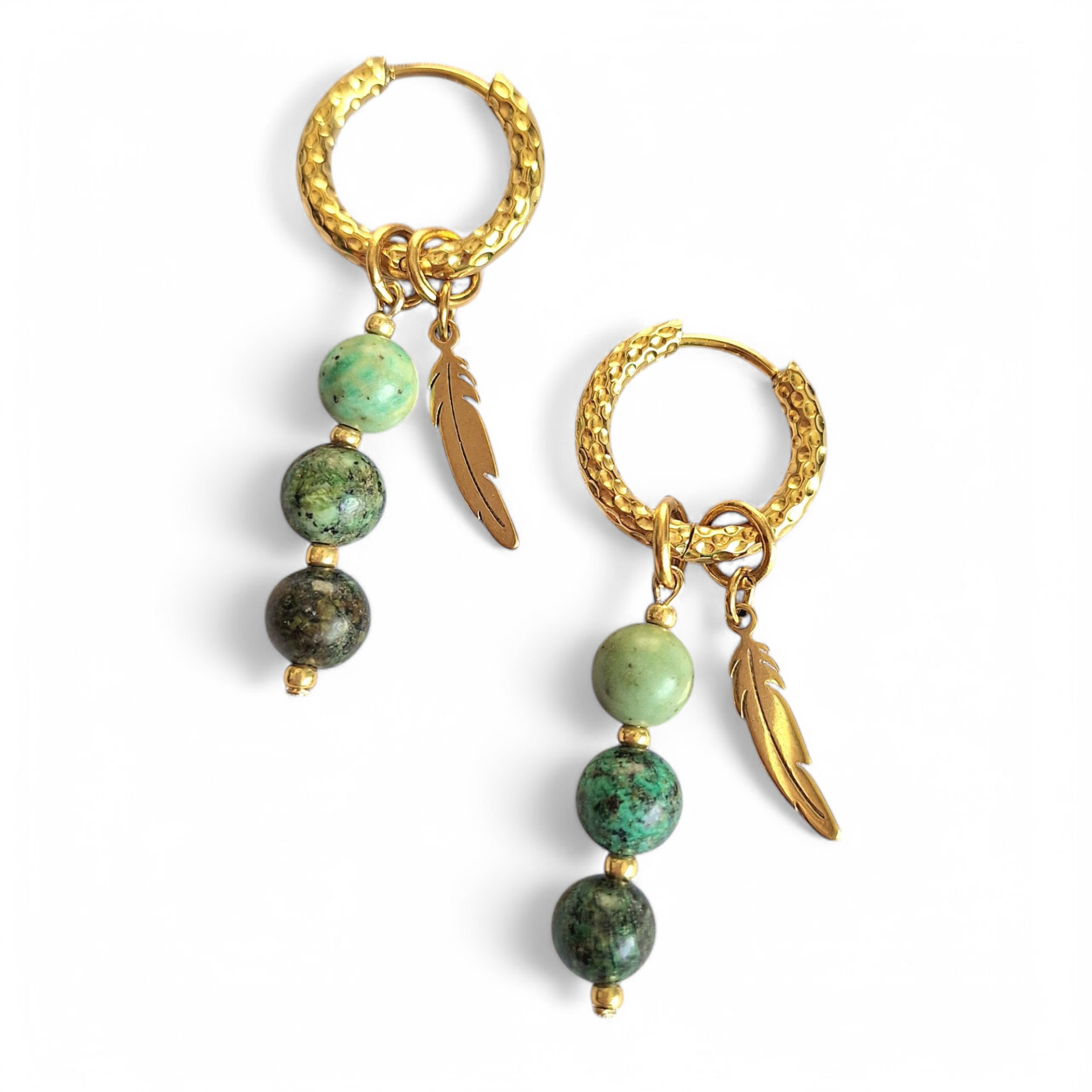 Deze RVS creolen (16,5 x 2,5 mm) hebben een hanger van Afrikaanse turkoois gecombineerd met een veertje bedel van stainless steel. Het ontwerp straalt een gevoel van vrijheid en verbinding met de natuur uit.