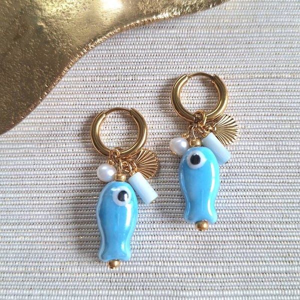 Deze RVS creolen (15 x 2 mm) zijn voorzien van een zomerse hanger met een blauwe keramieken vis, een lichtblauw schelpkraaltje, een zoetwaterpareltje en een stainless steel bedeltje in de vorm van een schelp. Een frisse combinatie van zachte blauwtinten en natuurlijke materialen die je direct meenemen naar een dag aan zee.