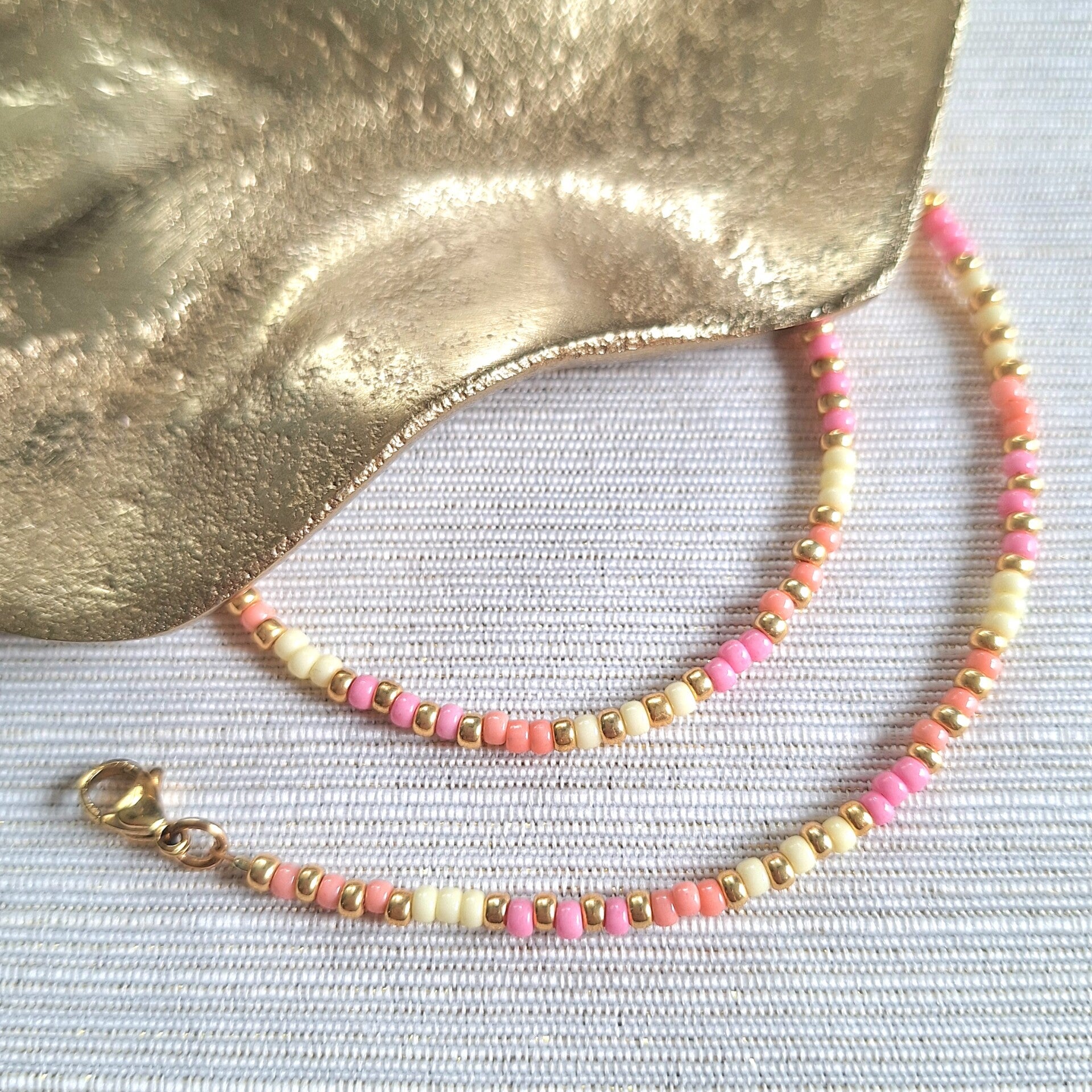 Deze handgemaakte kralenketting is gemaakt van fijne Miyuki kraaltjes in een speelse mix van pastelroze, zalm en lichtgeel. De ketting is 42 cm lang en voorzien van een stainless steel slotje met een verlengkettinkje van 7 cm, zodat je de lengte eenvoudig kunt aanpassen.