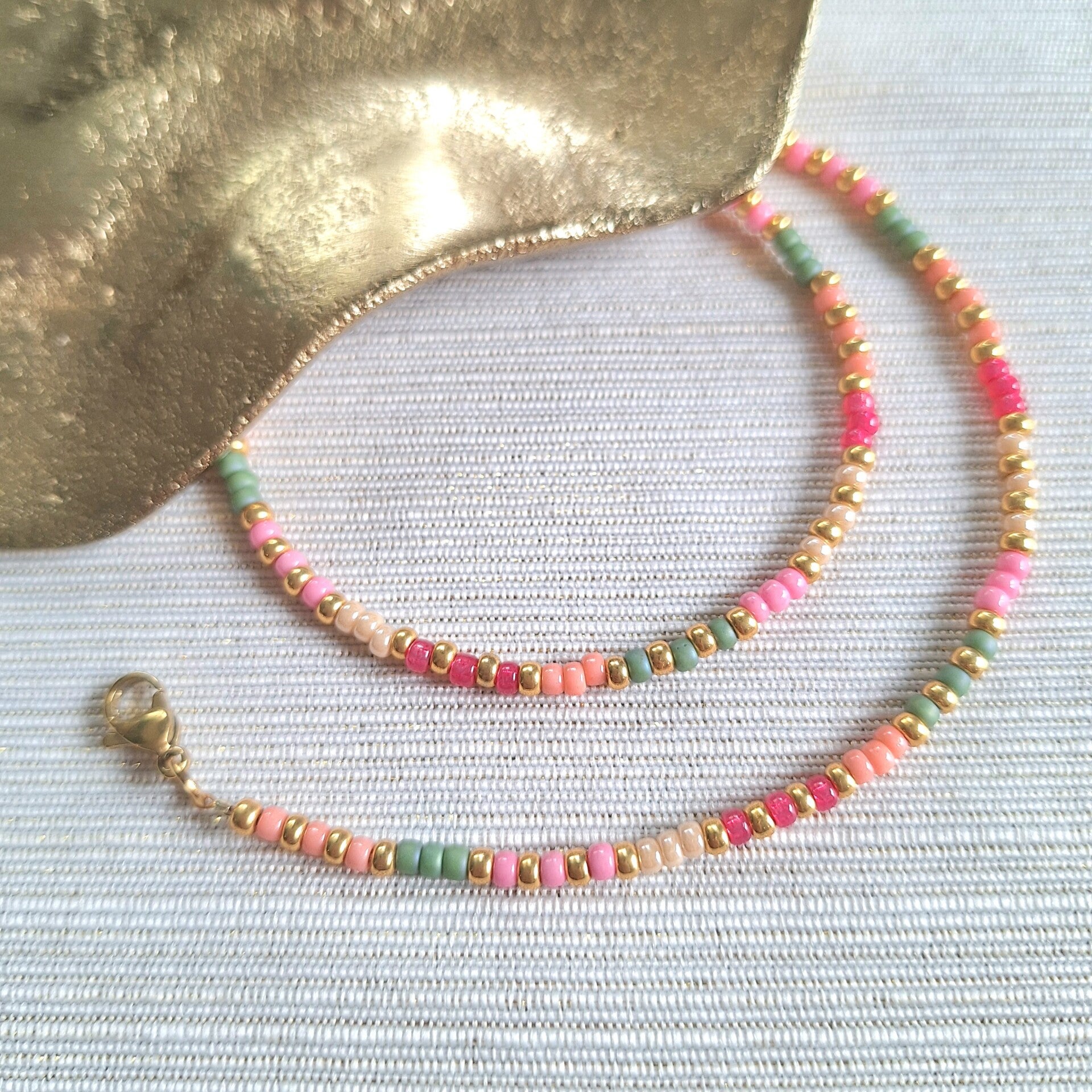 Deze handgemaakte kralenketting is gemaakt van fijne Miyuki kraaltjes in een levendige mix van groen, fuchsia, lichtroze, zalm en crèmekleur. De ketting is 42 cm lang en afgewerkt met een stainless steel slotje en een verlengkettinkje van 7 cm, zodat je zelf de perfecte pasvorm kunt bepalen.