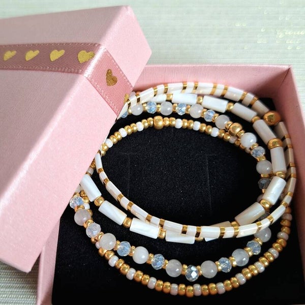 ✨ De overige armbanden zijn opgebouwd uit fijne witte kraaltjes, waaronder subtiele Miyuki kraaltjes. Deze Japanse glaskraaltjes staan bekend om hun perfecte vorm, gelijkmatige kleur en elegante uitstraling.