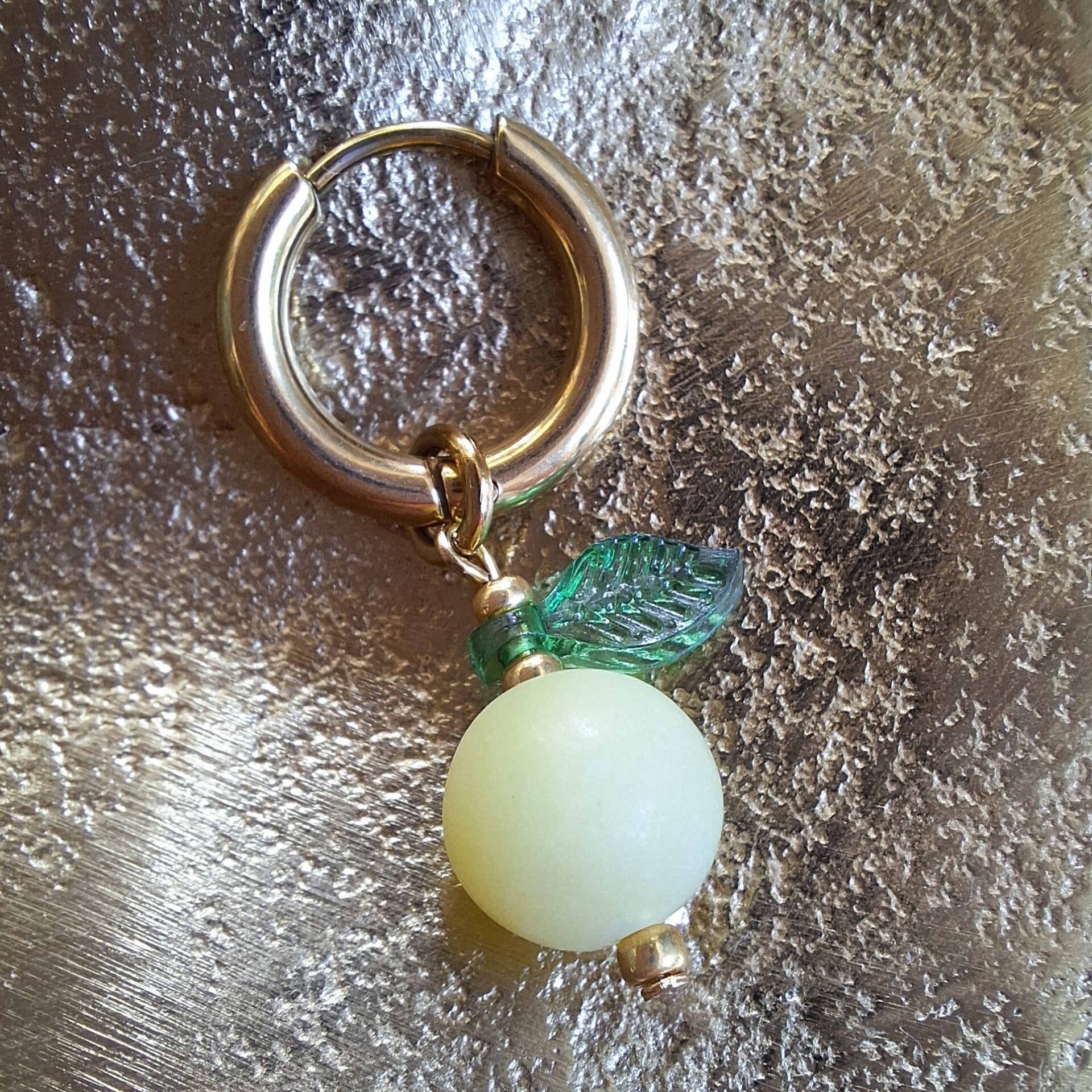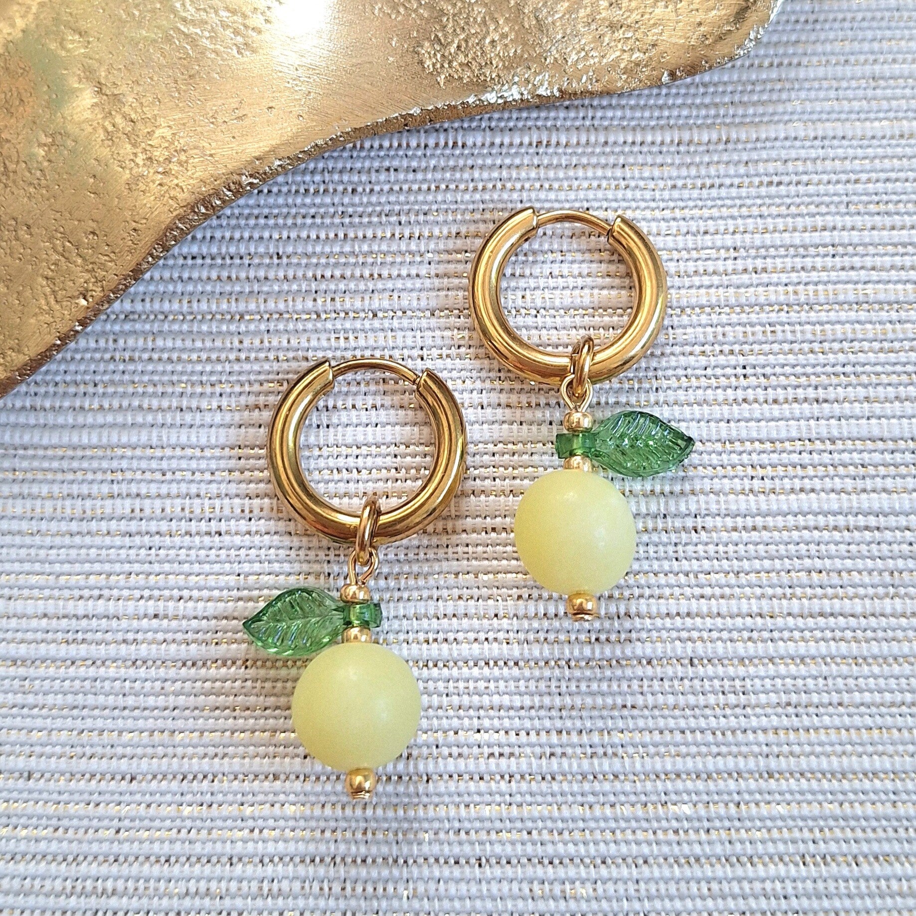 Deze oorbellen zijn geïnspireerd op het ultieme vakantiegevoel: Een ijskoude limoncello spritz op een zonovergoten terras. Het handgemaakte citroentje bestaat uit een matte frosted lemon jade kraal – zachtgeel van kleur, met een subtiele glans alsof hij net uit de vriezer komt. De afwerking met een groen geëmailleerd blaadje en goudkleurige details maakt het een frisse en elegante eyecatcher.