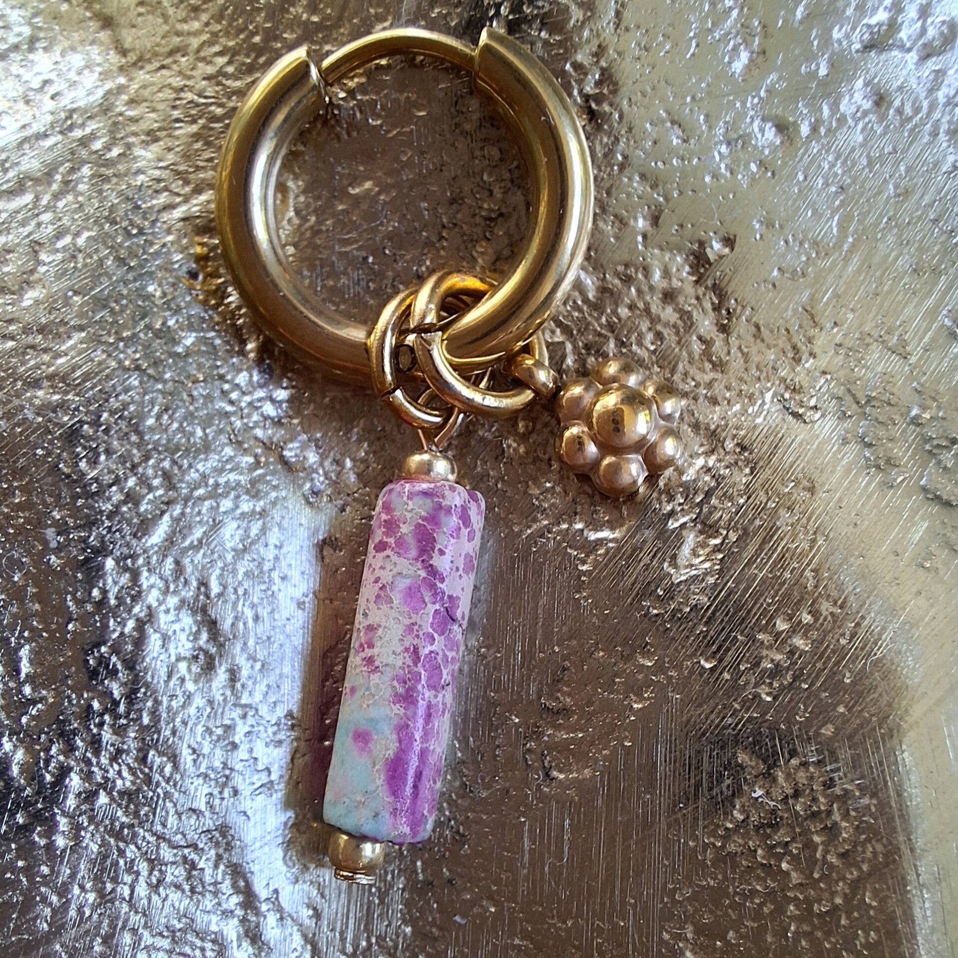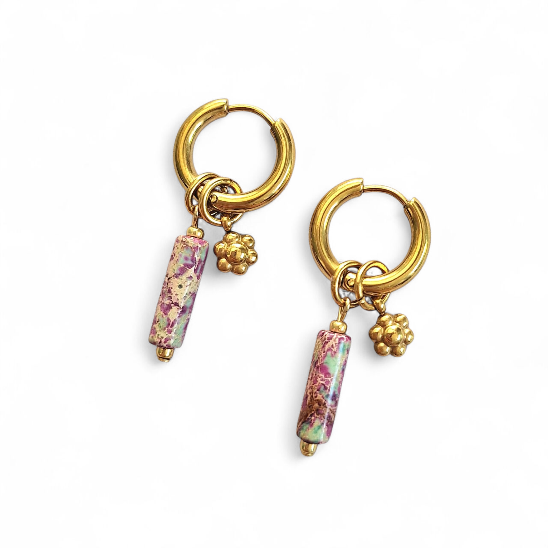 Deze goldplated stainless steel creolen (15,5 x 2,5 mm) zijn afgewerkt met een tube kraal van paarse jaspis en een klein bloemetje van stainless steel als bedel. Een vrolijke en verfijnde combinatie die kleur en elegantie toevoegt aan je sieradencollectie.