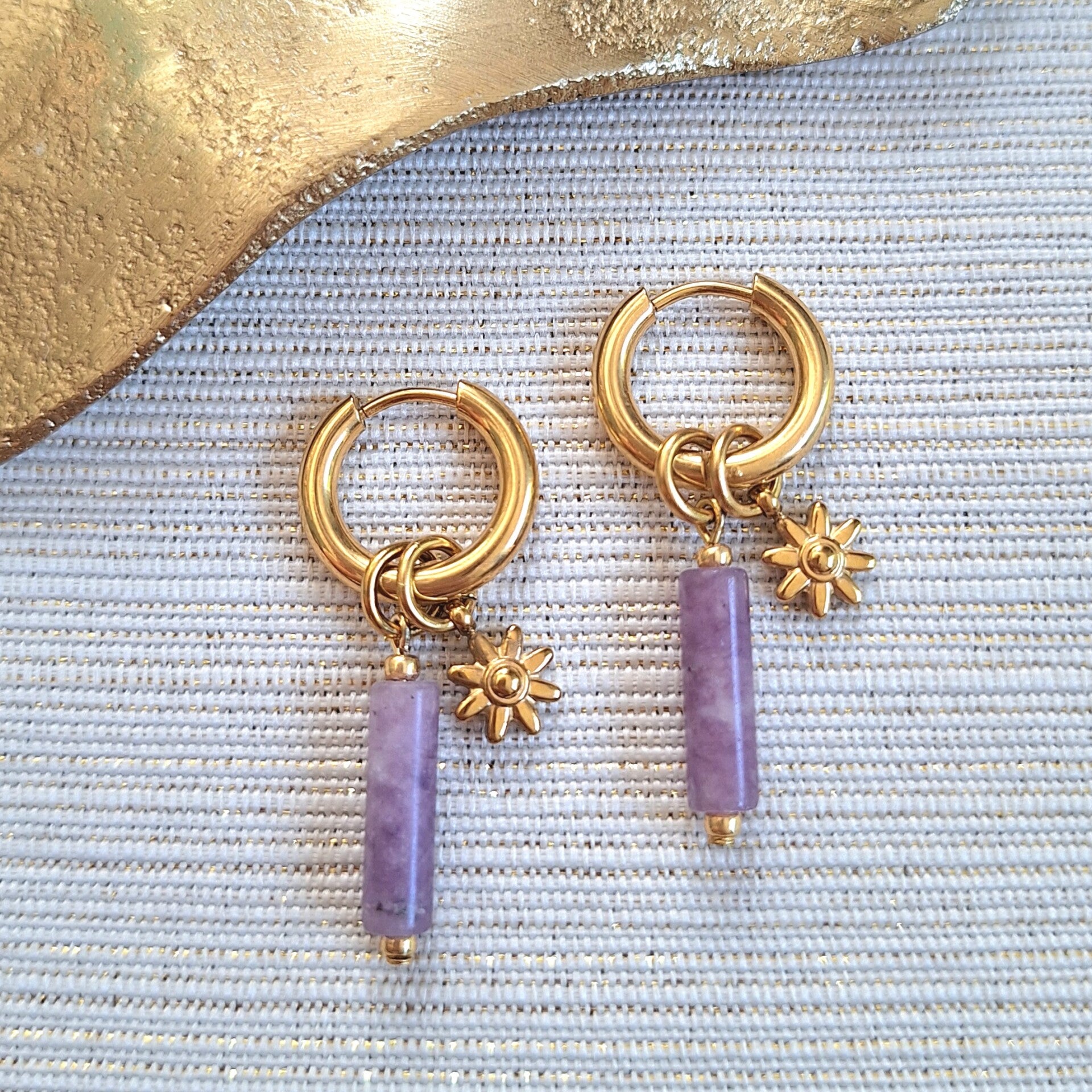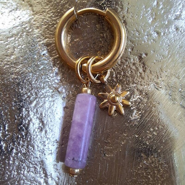 Deze goldplated stainless steel creolen (15,5 x 2,5 mm) zijn voorzien van een elegante tube kraal van paarse lepidoliet, gecombineerd met een verfijnde RVS bloembedel. Een stijlvolle oorbel met een zachte, rustgevende uitstraling.