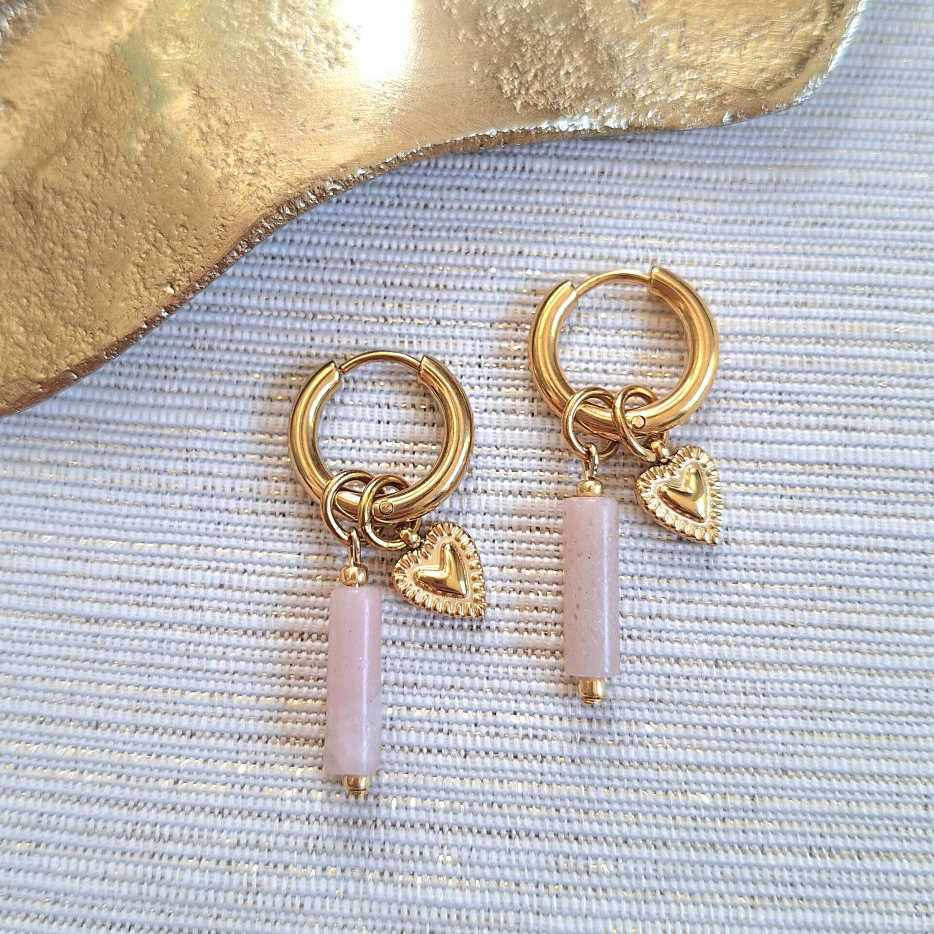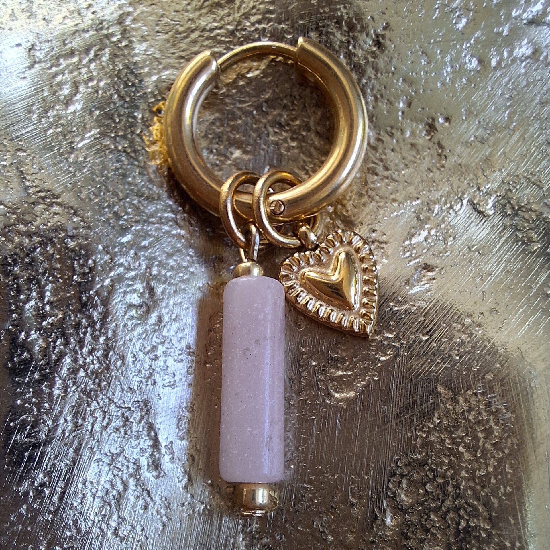 Deze goldplated stainless steel creolen (15,5 x 2,5 mm) zijn afgewerkt met een tube kraal van rozenkwarts en een hartvormig bedeltje van stainless steel. Een subtiele, romantische combinatie die zacht straalt en bij elke outfit past.