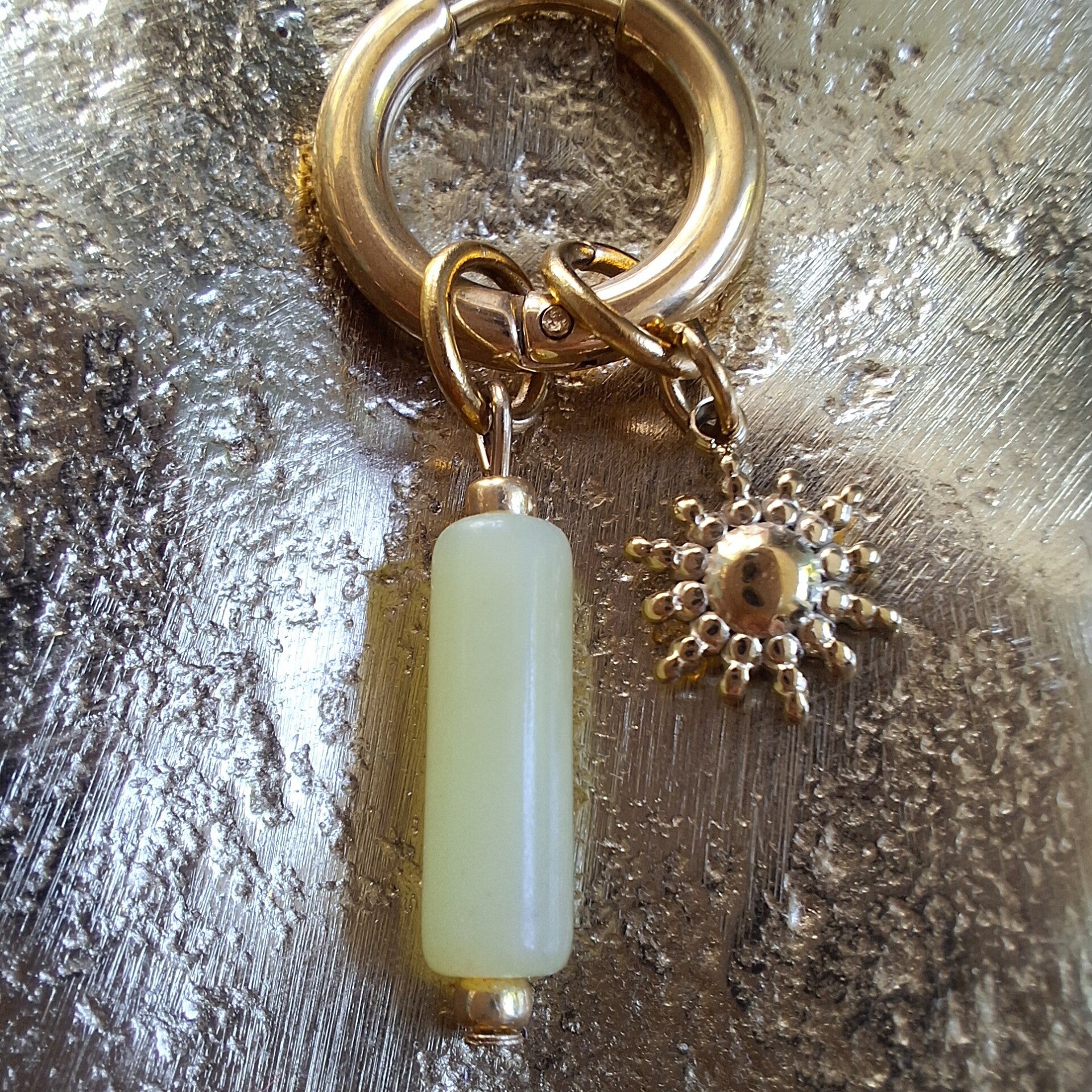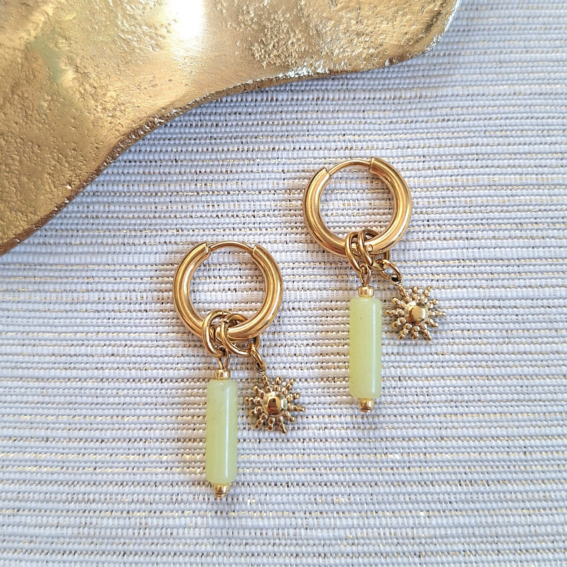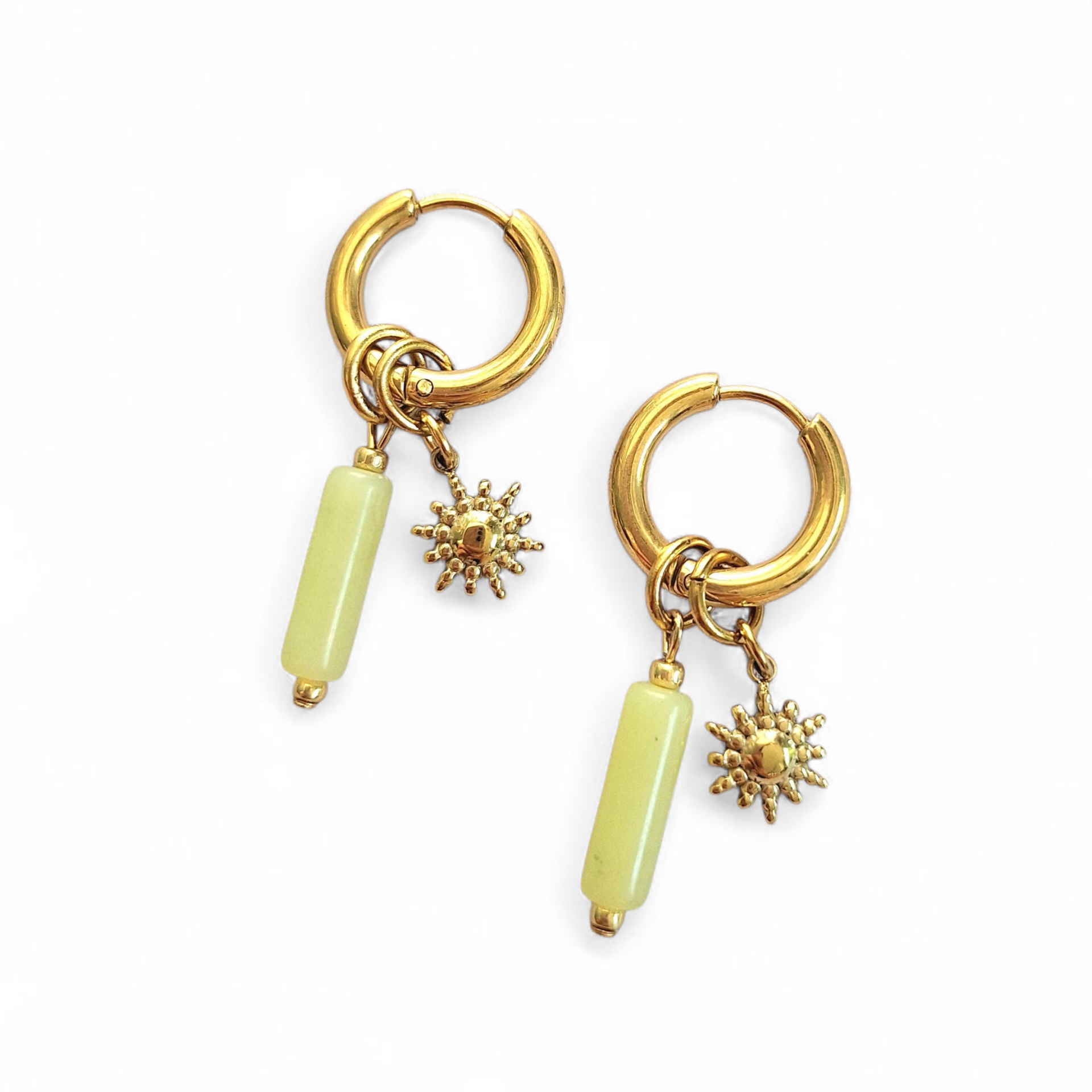 Deze goldplated stainless steel creolen (15,5 x 2,5 mm) zijn voorzien van een tube kraal van gele serpentijn en een zonvormige bedel van stainless steel. Een stijlvolle, zomerse combinatie die warmte en positiviteit uitstraalt.