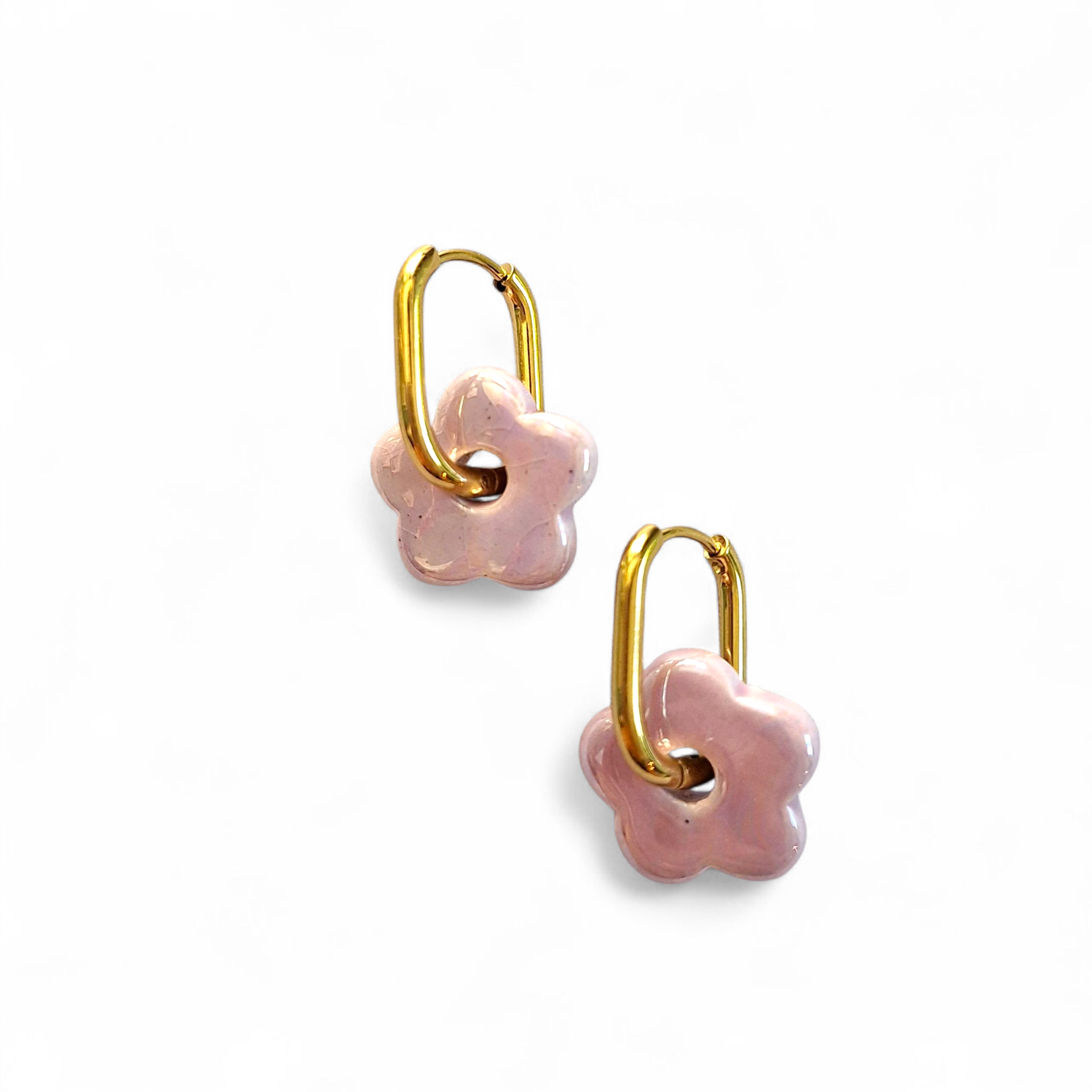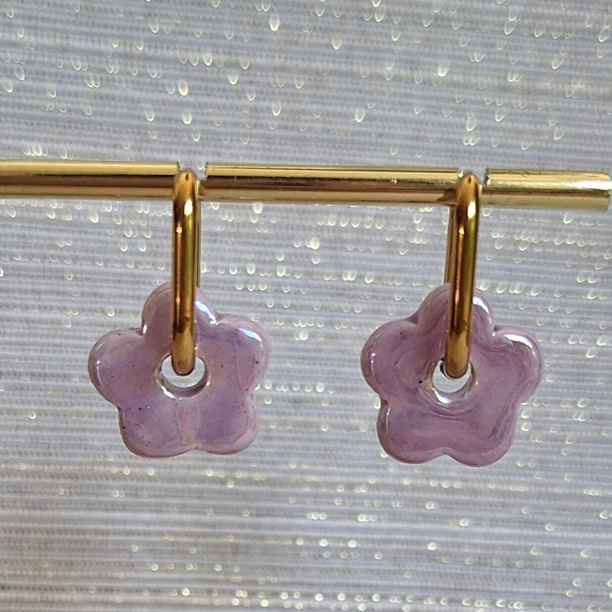 Deze goldplated stainless steel ovale hoops (16,5 x 11,5 mm) zijn versierd met een handgemaakt bloemetje van keramiek in een zachte lila tint (ca. 14–16 mm). Een subtiele eyecatcher die je look een romantisch en zomers accent geeft.