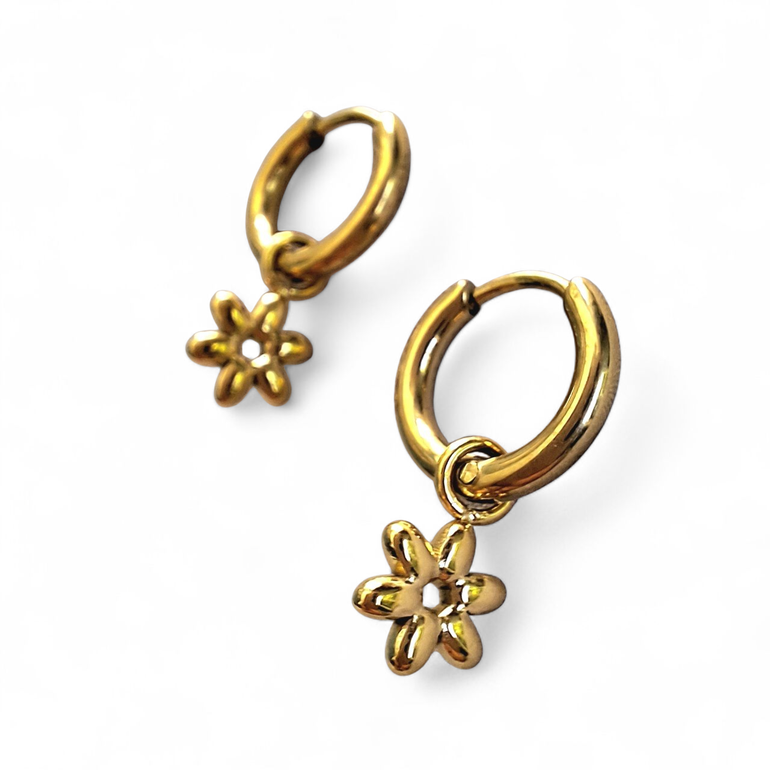 Deze verfijnde goudkleurige creolen (12 x 2 mm) zijn afgewerkt met een klein roestvrijstalen bloemetje – subtiel, speels en net even anders.