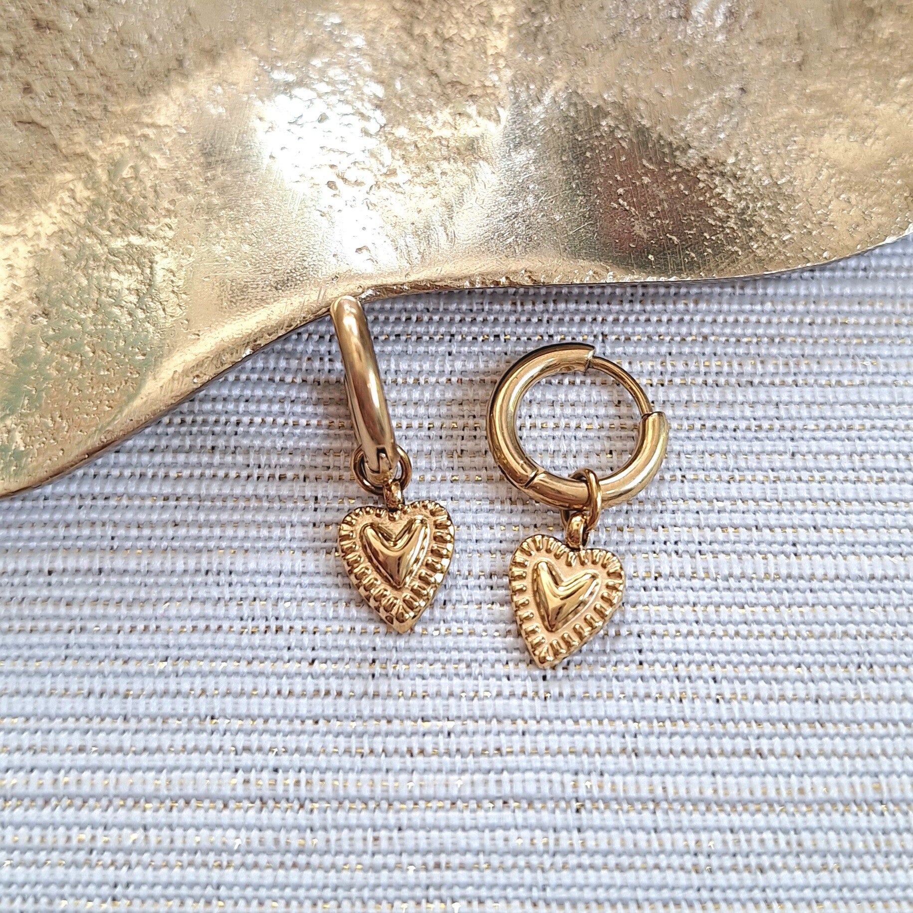 Deze lieve goudkleurige creolen (12 x 2 mm) zijn versierd met een klein, glanzend hartje van roestvrij staal. Een subtiel statement van liefde – perfect om cadeau te geven (of gewoon aan jezelf).