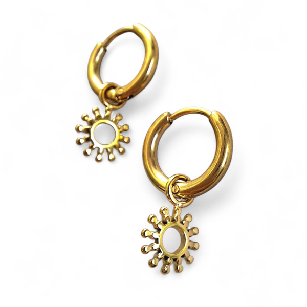 Deze stralende goudkleurige creolen (12 x 2 mm) zijn afgewerkt met een open, goudkleurig zonnetje van roestvrij staal. Een vrolijk en zonnig detail dat elke look direct opfleurt.