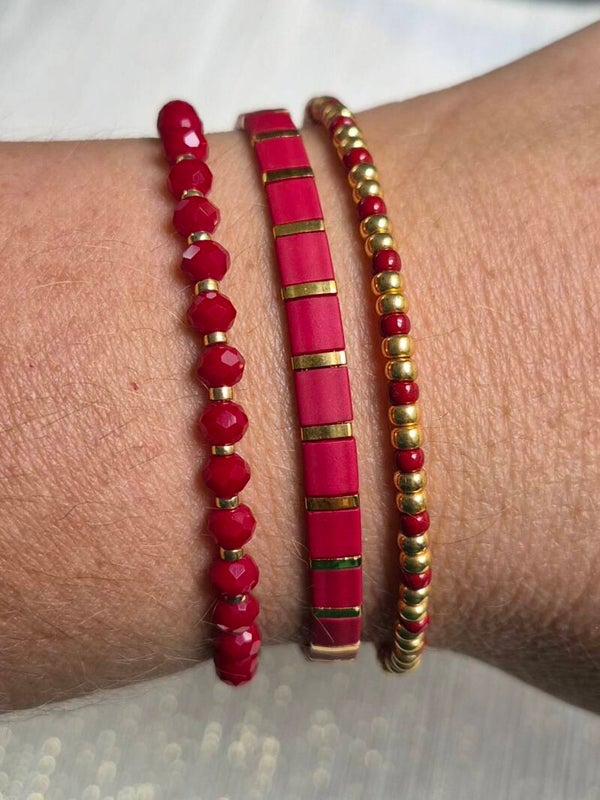 De armbandenset Crimson Flame is gemaakt van rode Miyuki glaskralen met subtiele goudaccenten voor een elegante en krachtige uitstraling.