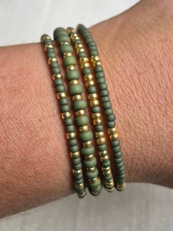 De armbandenset Olive Muse is gemaakt van olijfkleurige Miyuki glaskralen, subtiel gecombineerd met goudkleurige details.