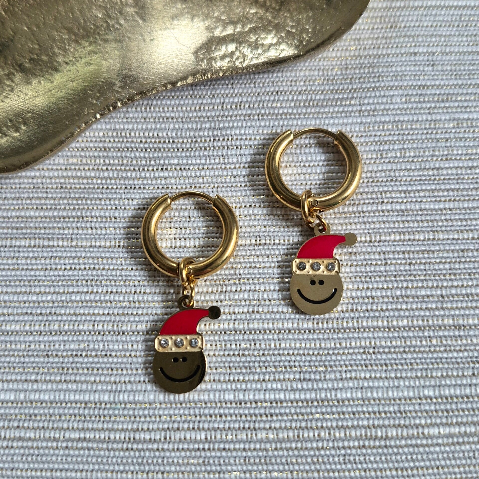 Deze goldplated RVS creolen hebben een vrolijke en feestelijke uitstraling. De creolen zijn 15x2,5 mm groot en voorzien van een hanger in de vorm van een kerstsmiley, afgewerkt met rode emaille en drie glittersteentjes. Perfect om je look tijdens de feestdagen een speels en sprankelend accent te geven. Handgemaakt met oog voor detail en kwaliteit.