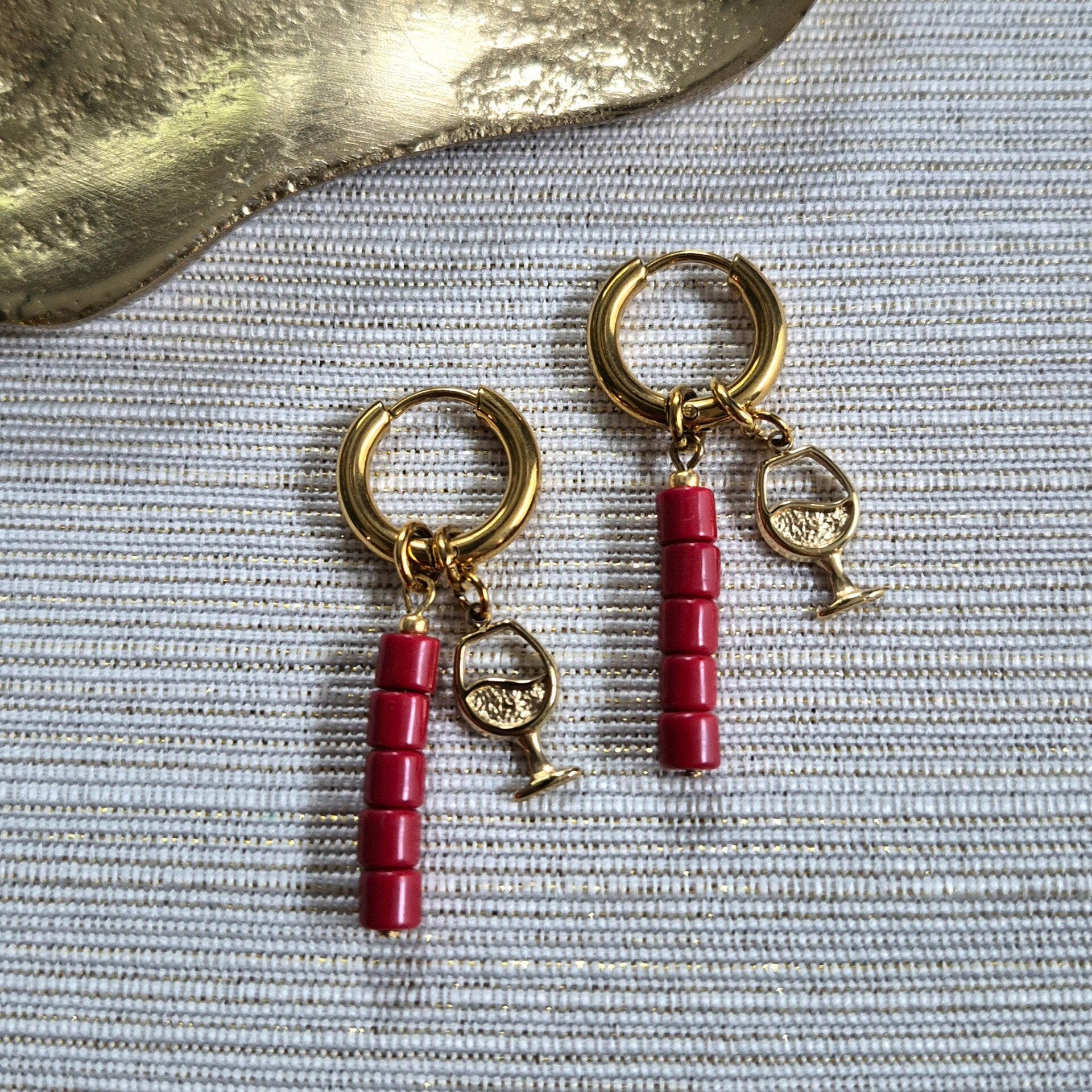 Creolen met rode kraaltjes en RVS wijnglaasje