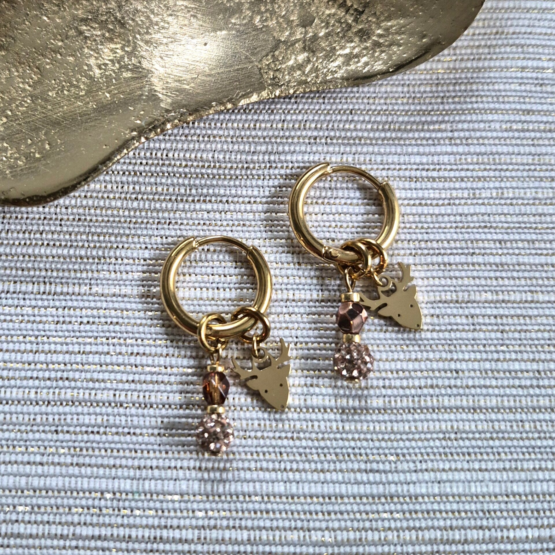Deze goldplated RVS creolen hebben een feestelijke uitstraling. De creolen zijn 14x2 mm groot en voorzien van een bruin glittersteentje en een klein RVS rendiertje. Perfect om je look tijdens de feestdagen een speels en sprankelend accent te geven. Handgemaakt met oog voor detail en kwaliteit.