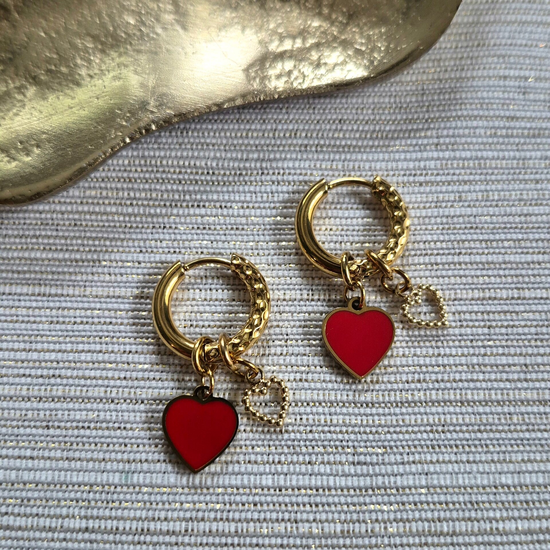 Deze goldplated RVS creolen hebben een speelse en feestelijke uitstraling. De creolen zijn 15x2,5 mm groot en voorzien van een hanger met een rood emaille hartje en een open RVS hartje. Perfect om je look tijdens de feestdagen of andere bijzondere gelegenheden een sprankelend en romantisch accent te geven. Handgemaakt met oog voor detail en kwaliteit.