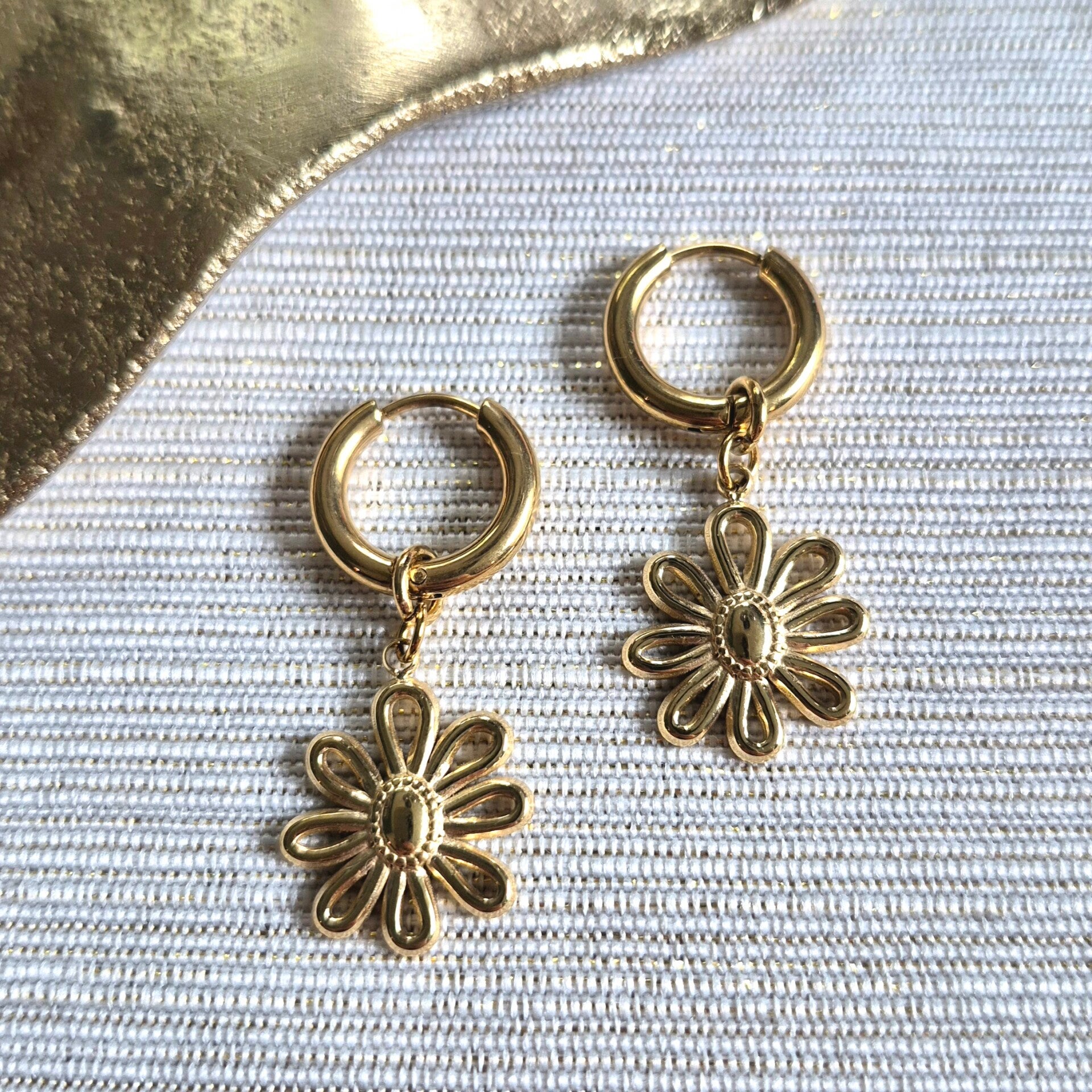 Deze goldplated RVS creolen hebben een elegante en feestelijke uitstraling. De creolen zijn 15x2,5 mm groot en voorzien van een hanger in de vorm van een open RVS bloem. Perfect om je look een verfijnd en sprankelend accent te geven. Handgemaakt met oog voor detail en kwaliteit.