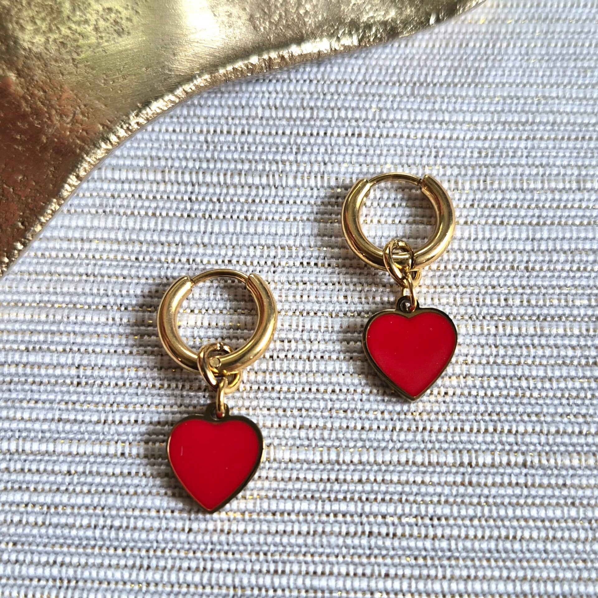 Deze goldplated RVS creolen hebben een subtiele en speelse uitstraling. De creolen zijn 12x2 mm groot en voorzien van een hanger in de vorm van een rood RVS hartje van enamel. Perfect om je look een vrolijk en sprankelend accent te geven. Handgemaakt met oog voor detail en kwaliteit.