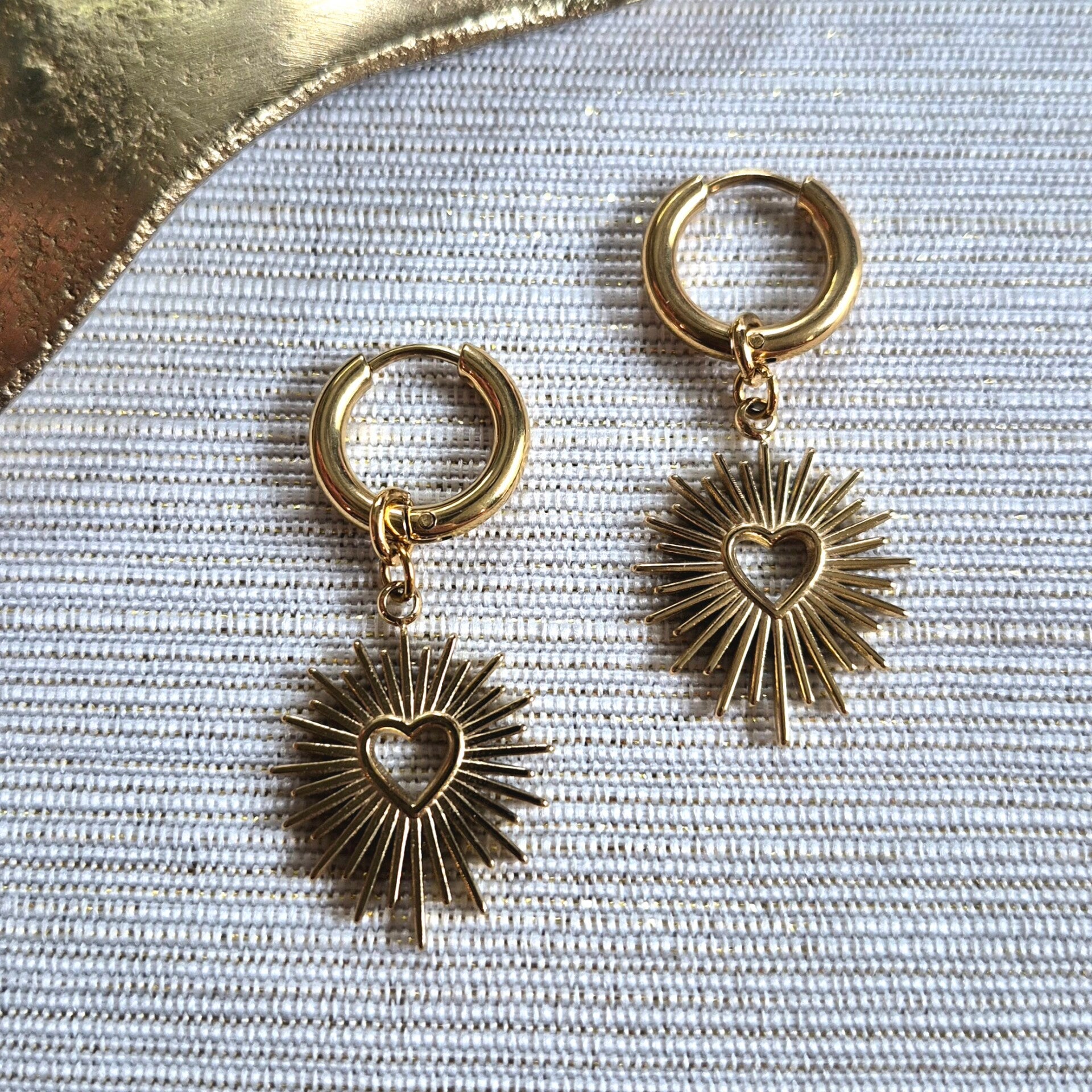 Deze goldplated RVS creolen hebben een elegante en feestelijke uitstraling. De creolen zijn 15x2,5 mm groot en voorzien van een hanger in de vorm van een RVS zonbedel. Perfect om je look een sprankelend en subtiel accent te geven. Handgemaakt met oog voor detail en kwaliteit.