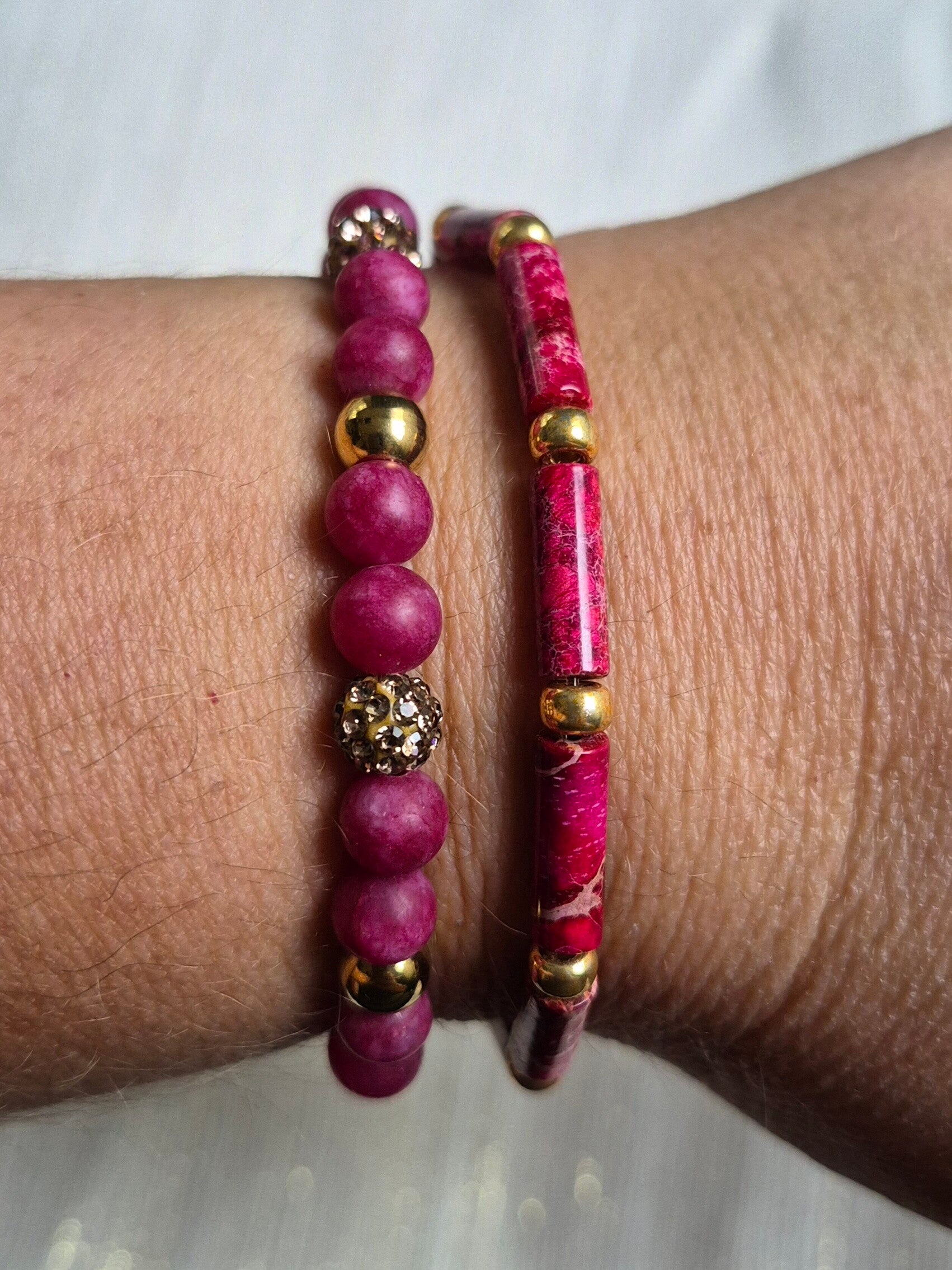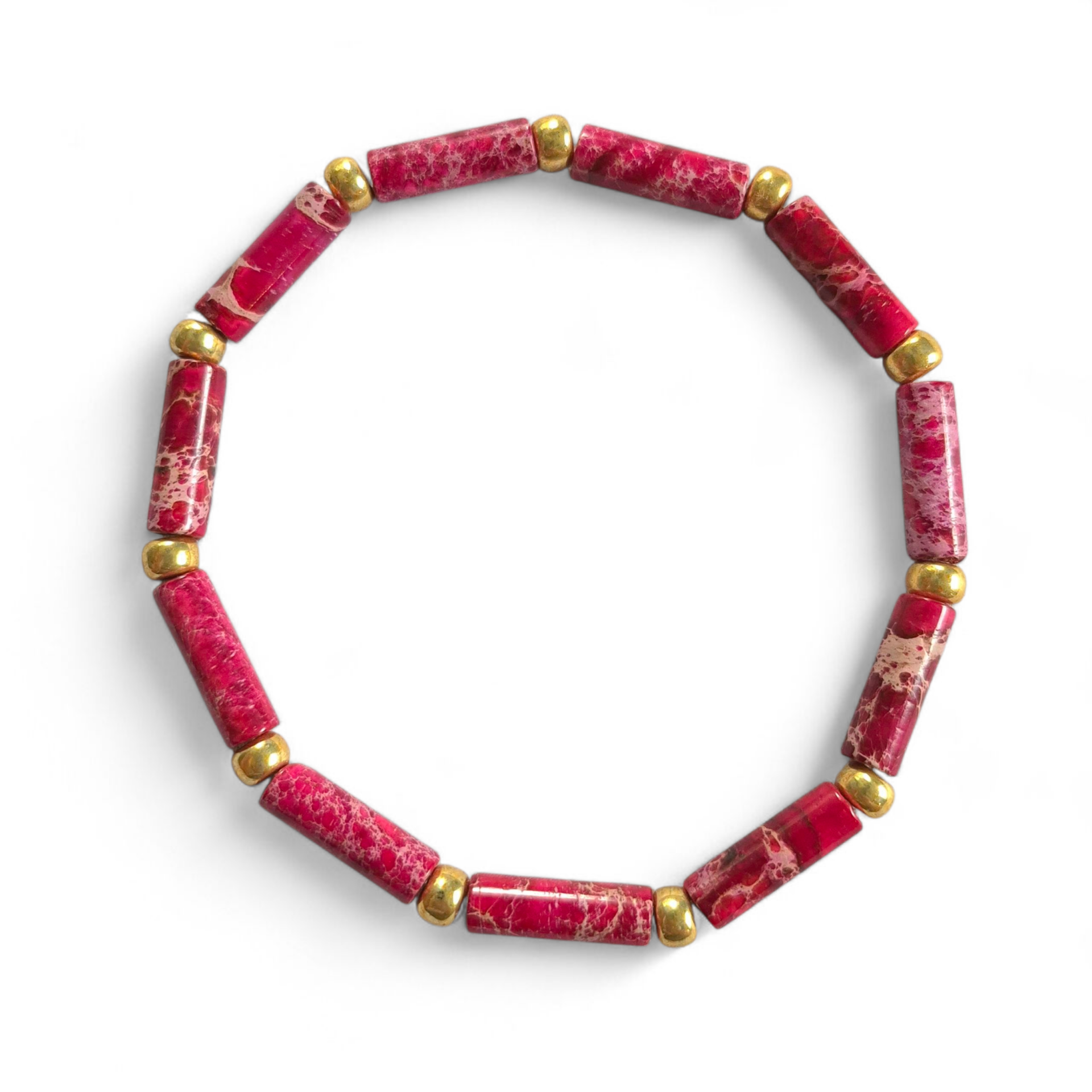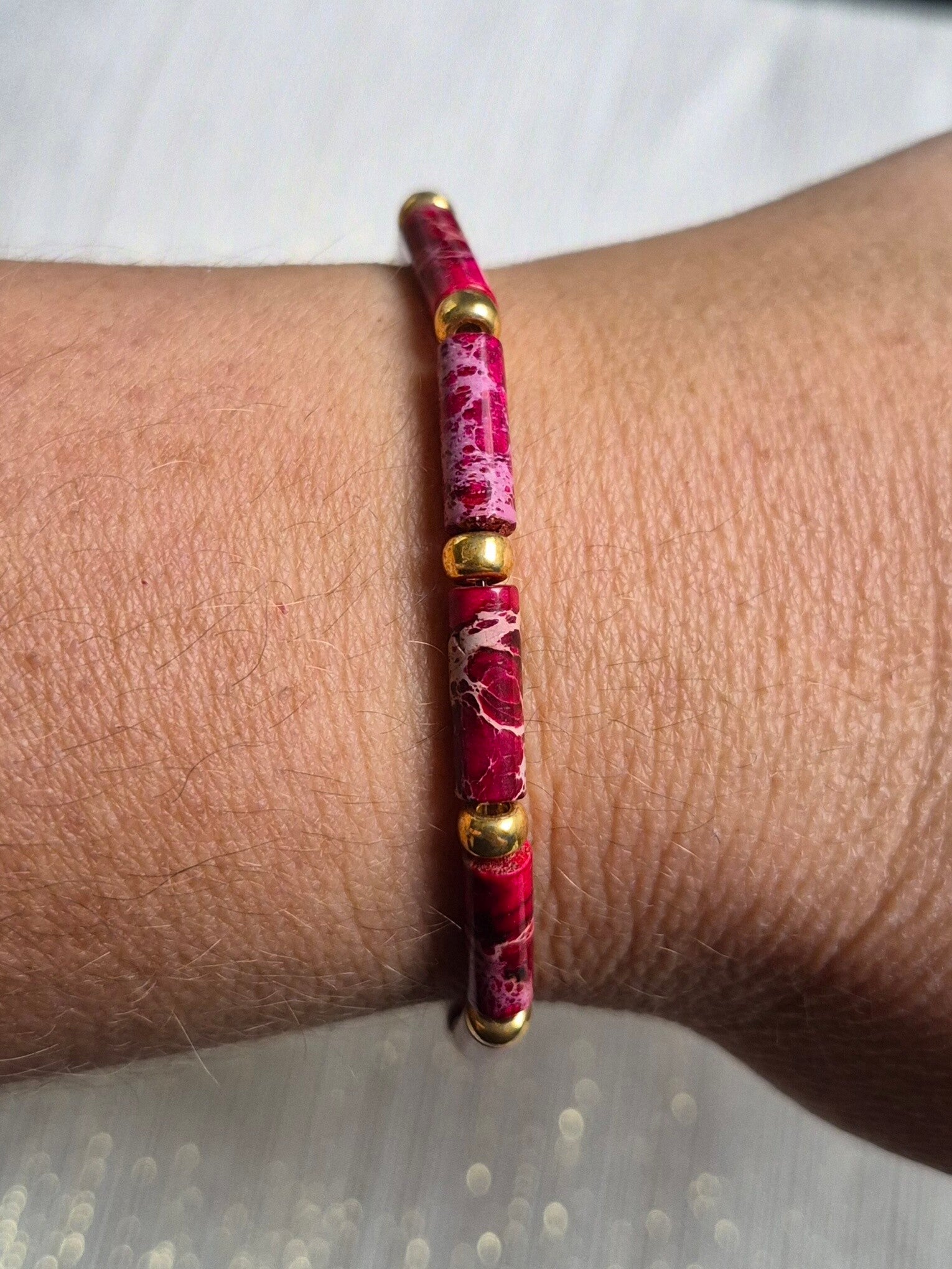 Deze handgemaakte armband is gemaakt van 12x4 mm Imperial Jasper tube kralen, gecombineerd met goudkleurige RVS accentkralen.