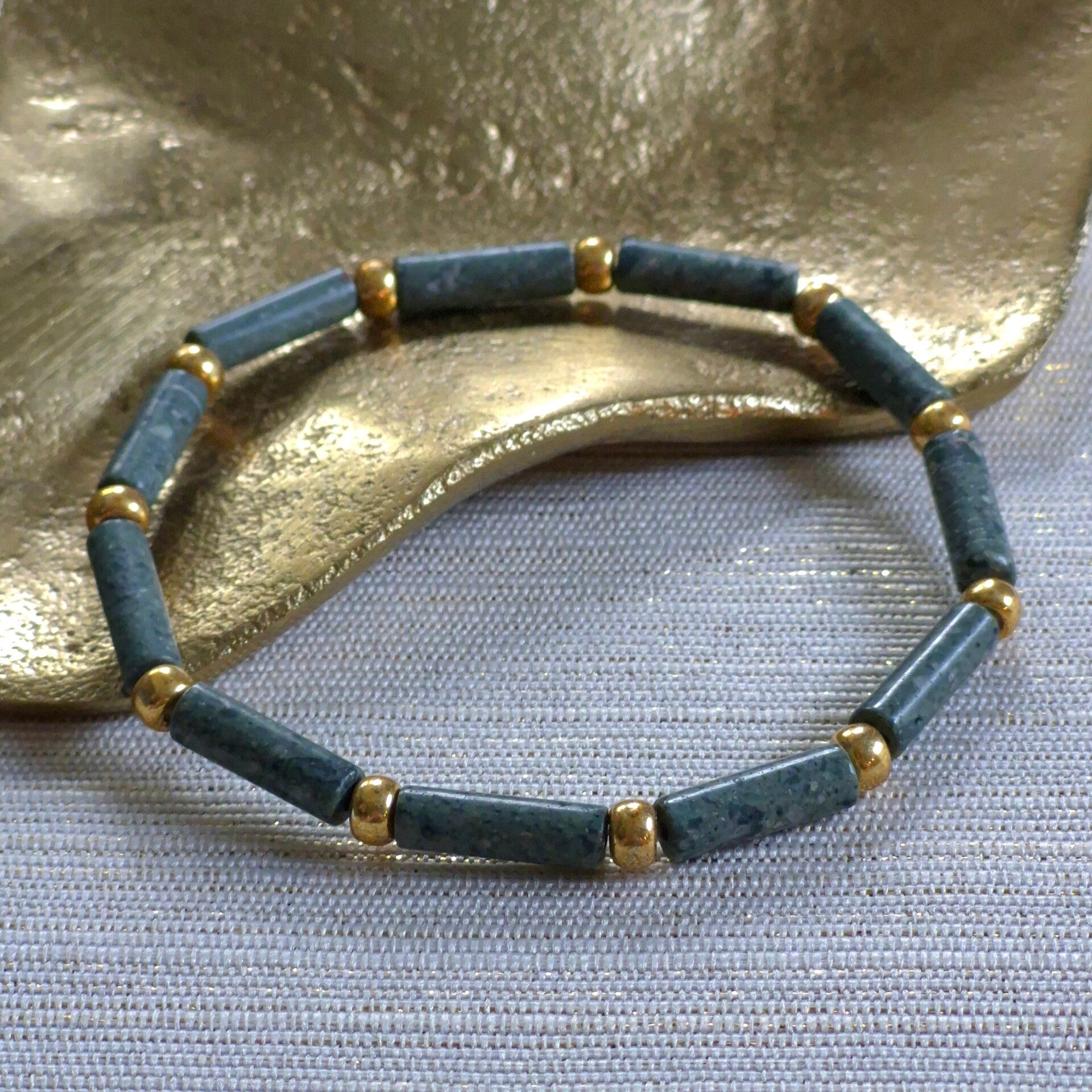 Deze handgemaakte armband is gemaakt van 12x4 mm serpentijn tube kralen, gecombineerd met goudkleurige RVS accentkralen.