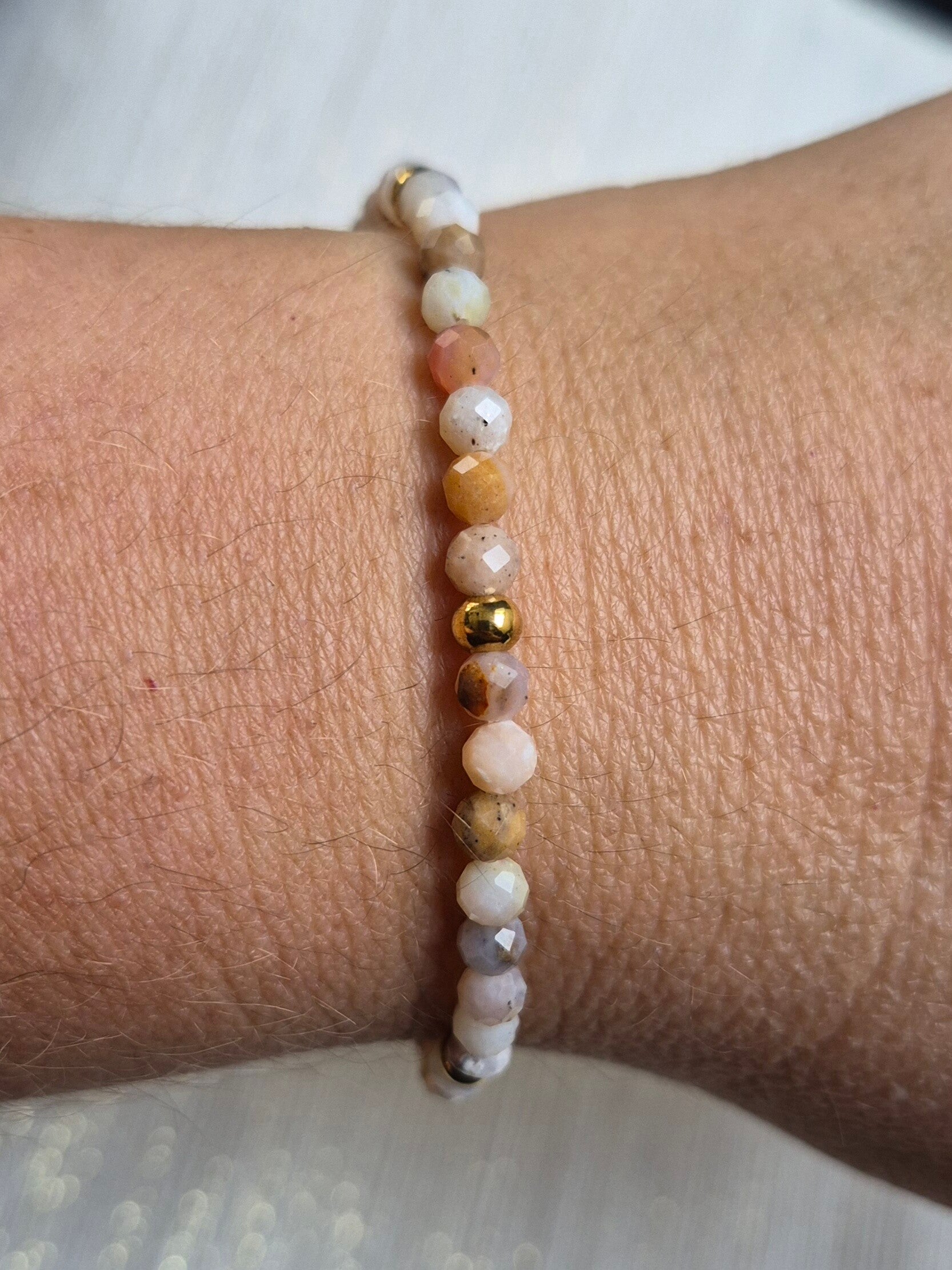 Deze handgemaakte armband is gemaakt van 4 mm facet geslepen opaal kralen, gecombineerd met goudkleurige RVS kralen.