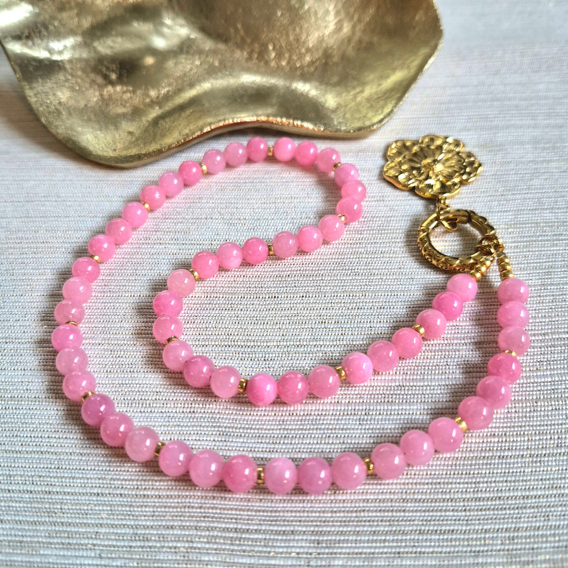 Deze handgemaakte ketting is gemaakt van natuurlijke roze calciet kralen en afgewerkt met een clasp van hoogwaardig goldplated stainless steel. Aan de clasp hangt een elegante bloembedel van RVS, die het sieraad een verfijnde en vrouwelijke uitstraling geeft.
